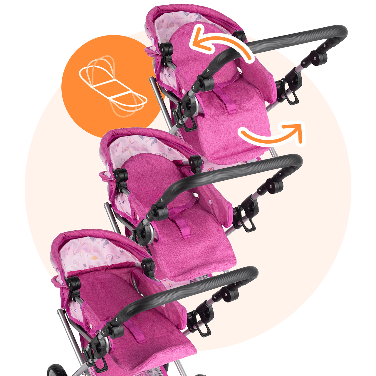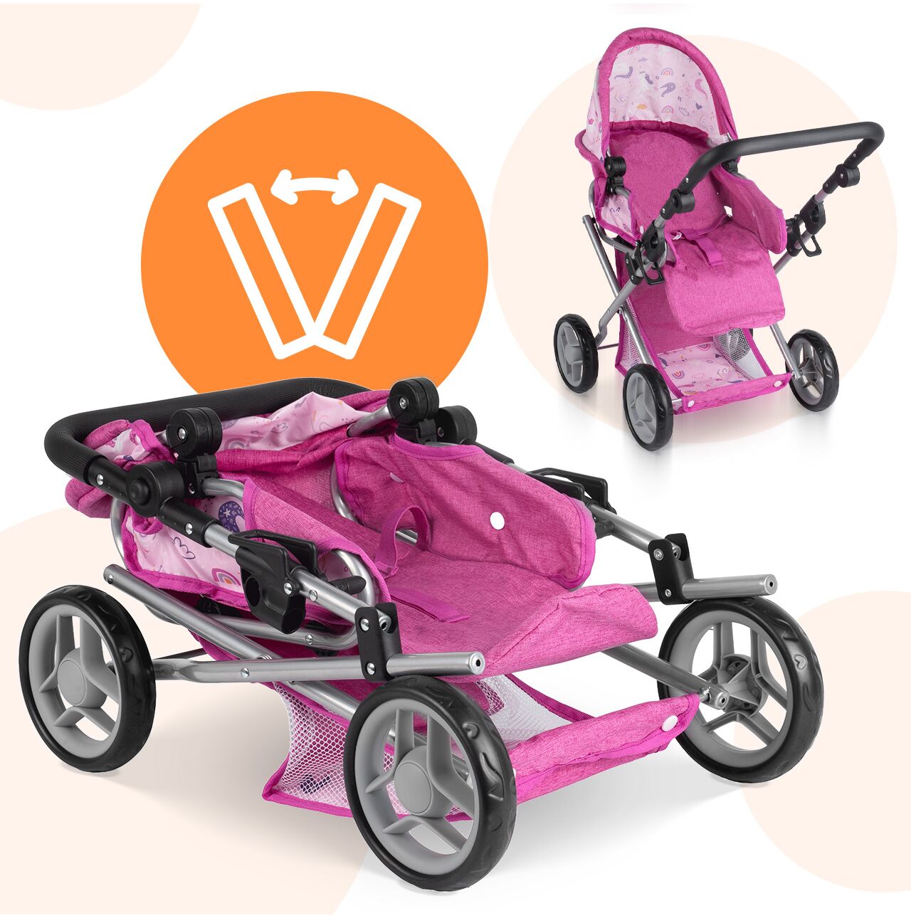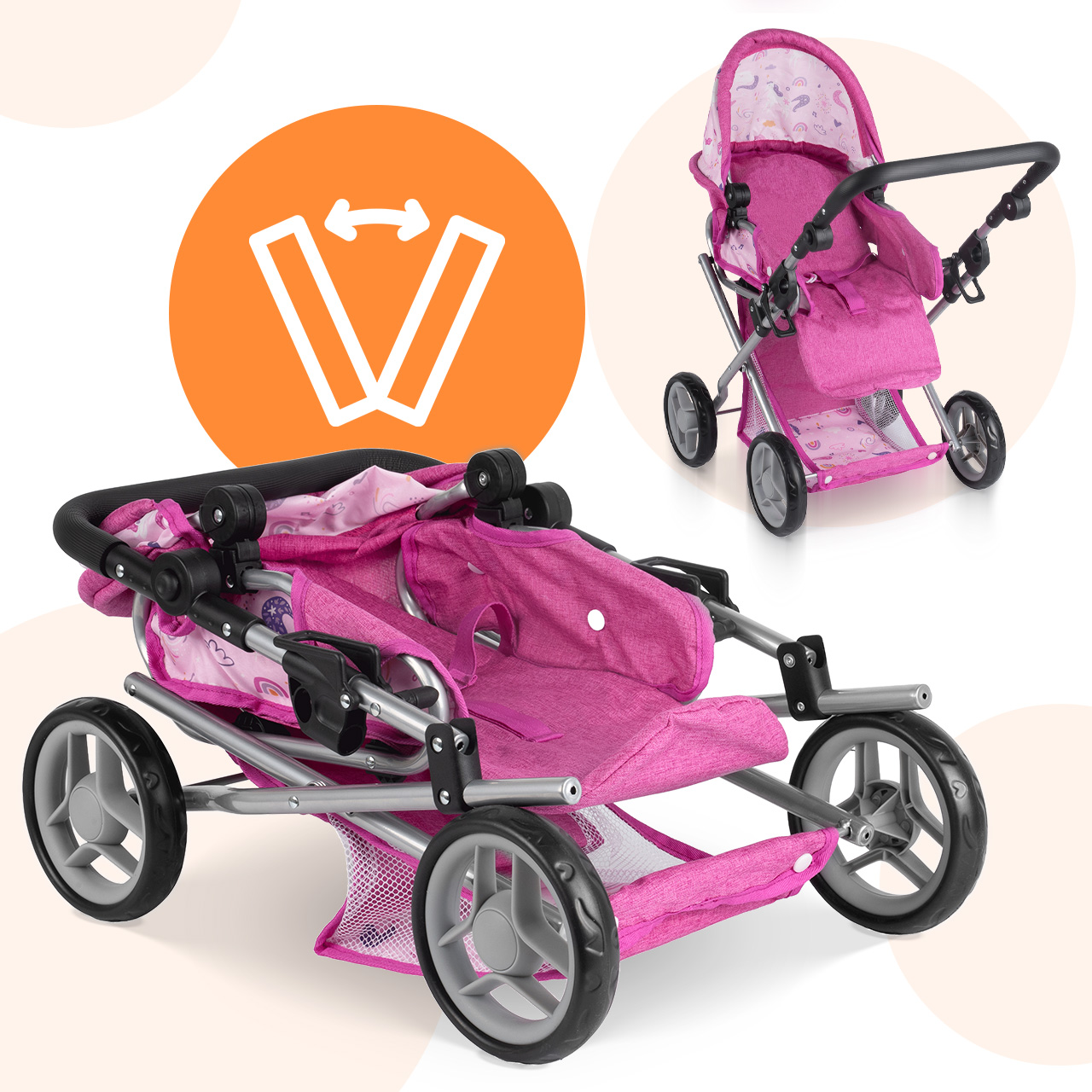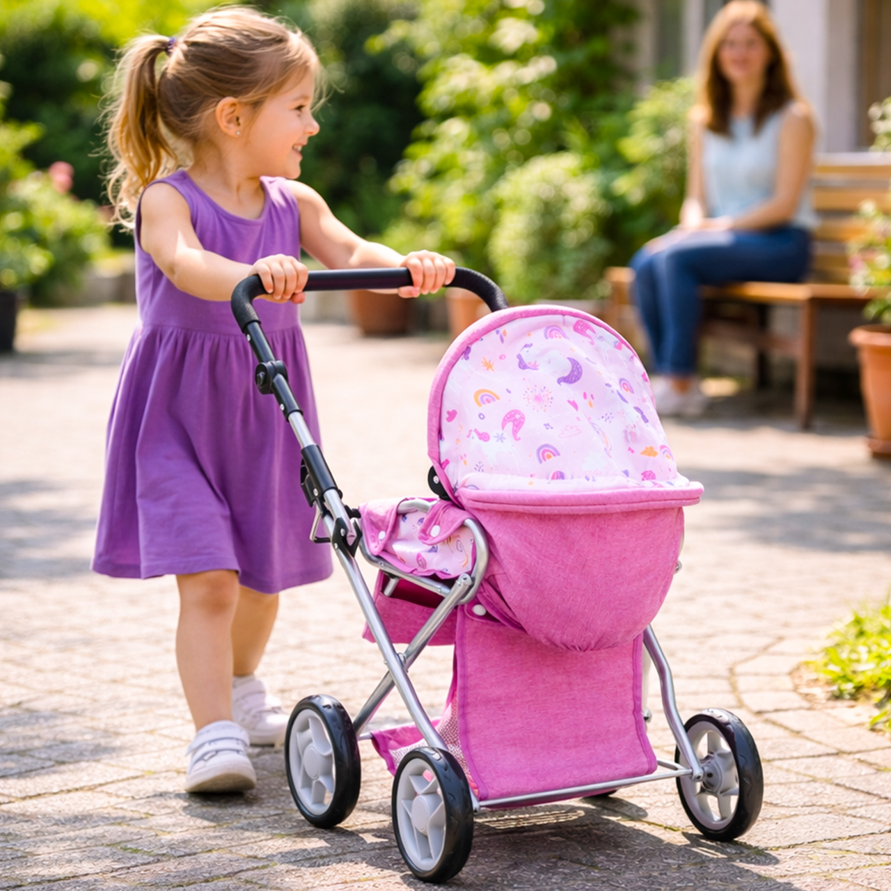 Stříška kočárku Unicorns lze nastavit do různých úhlů , což usnadňuje přizpůsobení hernímu prostředí: někdy chrání panenku během procházky, jindy je dále venku, když dítě potřebuje lepší přístup. Tento jednoduchý detail dodává hře nádech realismu a umožňuje plynulý přechod mezi zdřímnutím v gondole a aktivní procházkou.