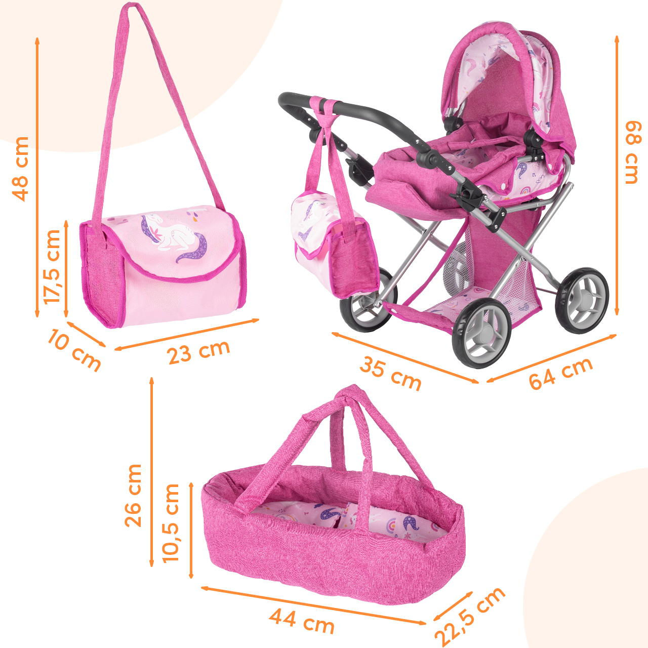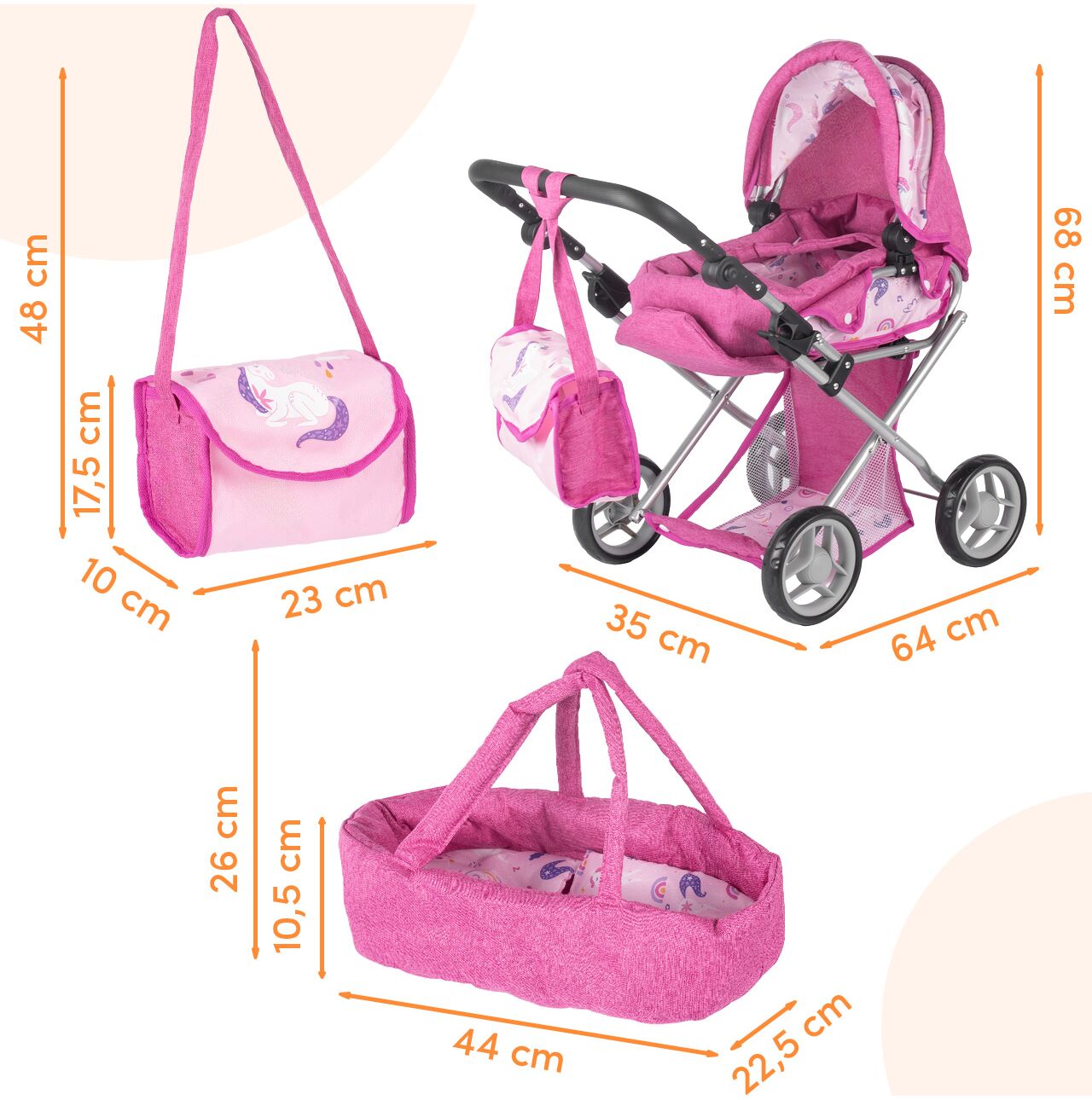 - Rozměry kočárku v gondolovém provedení: 68 × 35 × 64 cm