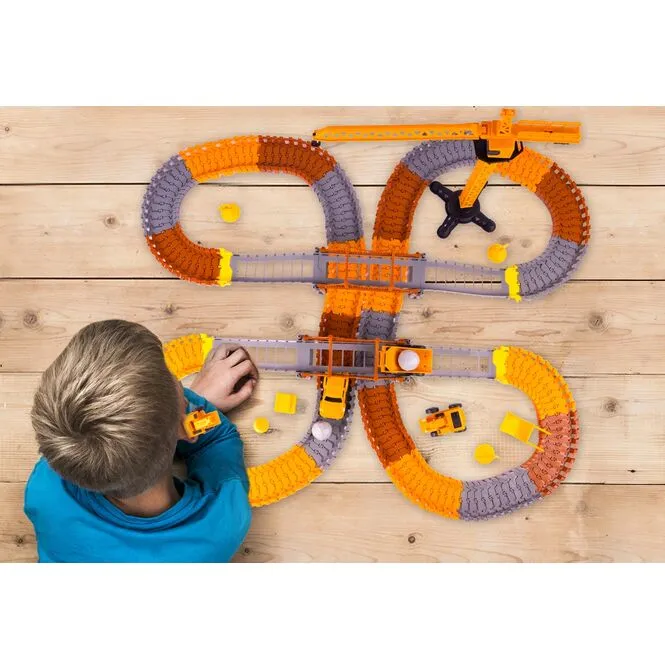Zestaw oprócz głównego autka zasilanego, który porusza się bezpośrednio po torze wyposażony został w trzy resoraki. Każdy pojazd z kolekcji jest wyjątkowy. Jak na placu budowy tak i w naszym zestawie nie zabrakło koparki, wywrotki i buldożera. Resoraki posiadają ręczny napęd, który sprawi, że puszczone w ruch nie zatrzymają się szybko. Oto cała kolekcja - zaproś więc przyjaciół i bawcie się w najlepsze z tymi niepowtarzalnymi pojazdami.