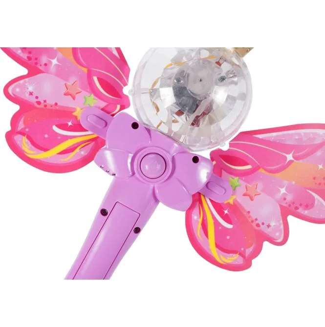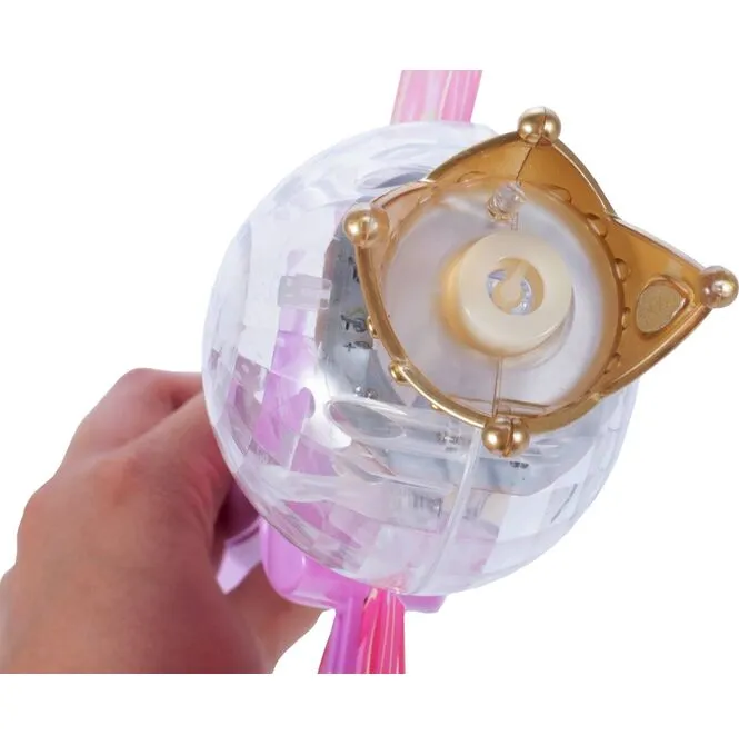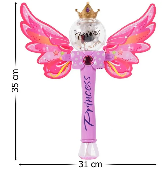Při hraní vylétají z koruny mýdlové bubliny. Doprovází ji veselá melodie a blikající LED diody umístěné v hůlkové kouli.