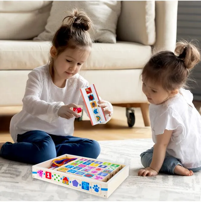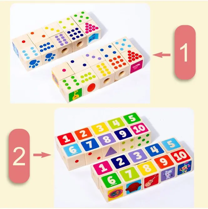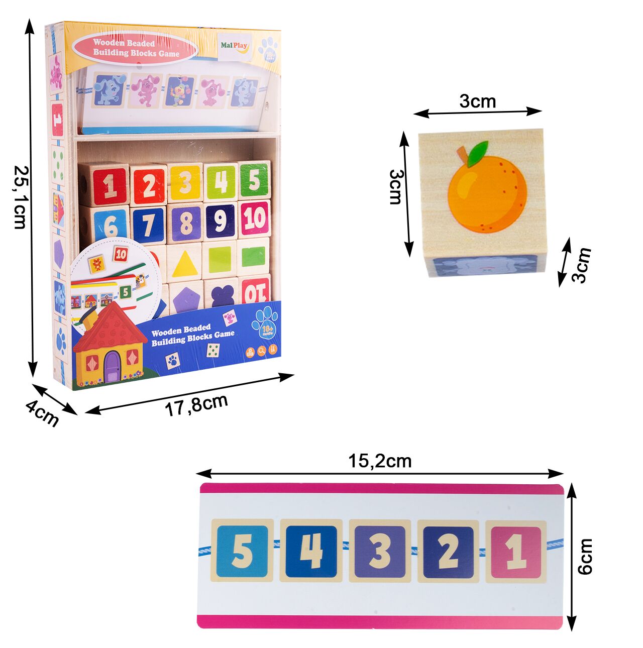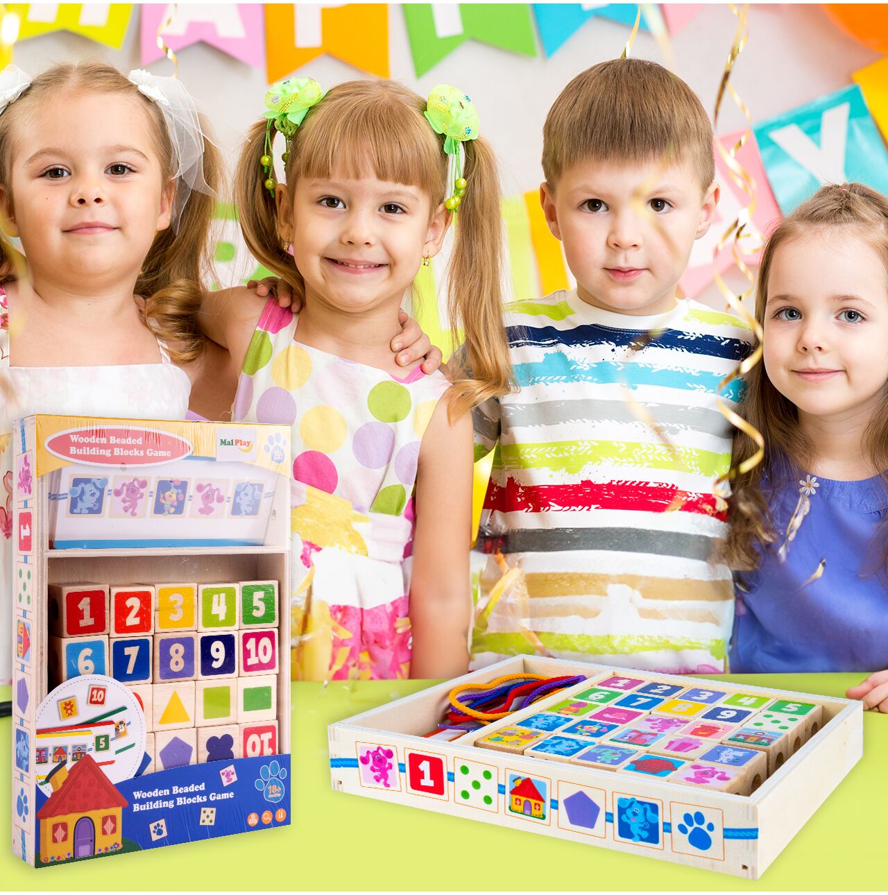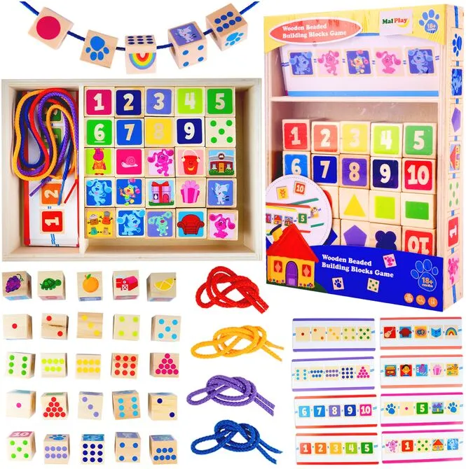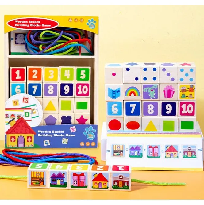 Dřevěné navlékací bloky jsou ideální pro učení základních čísel, barev a tvarů.