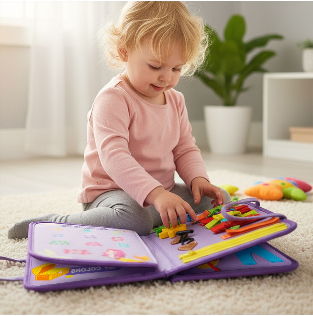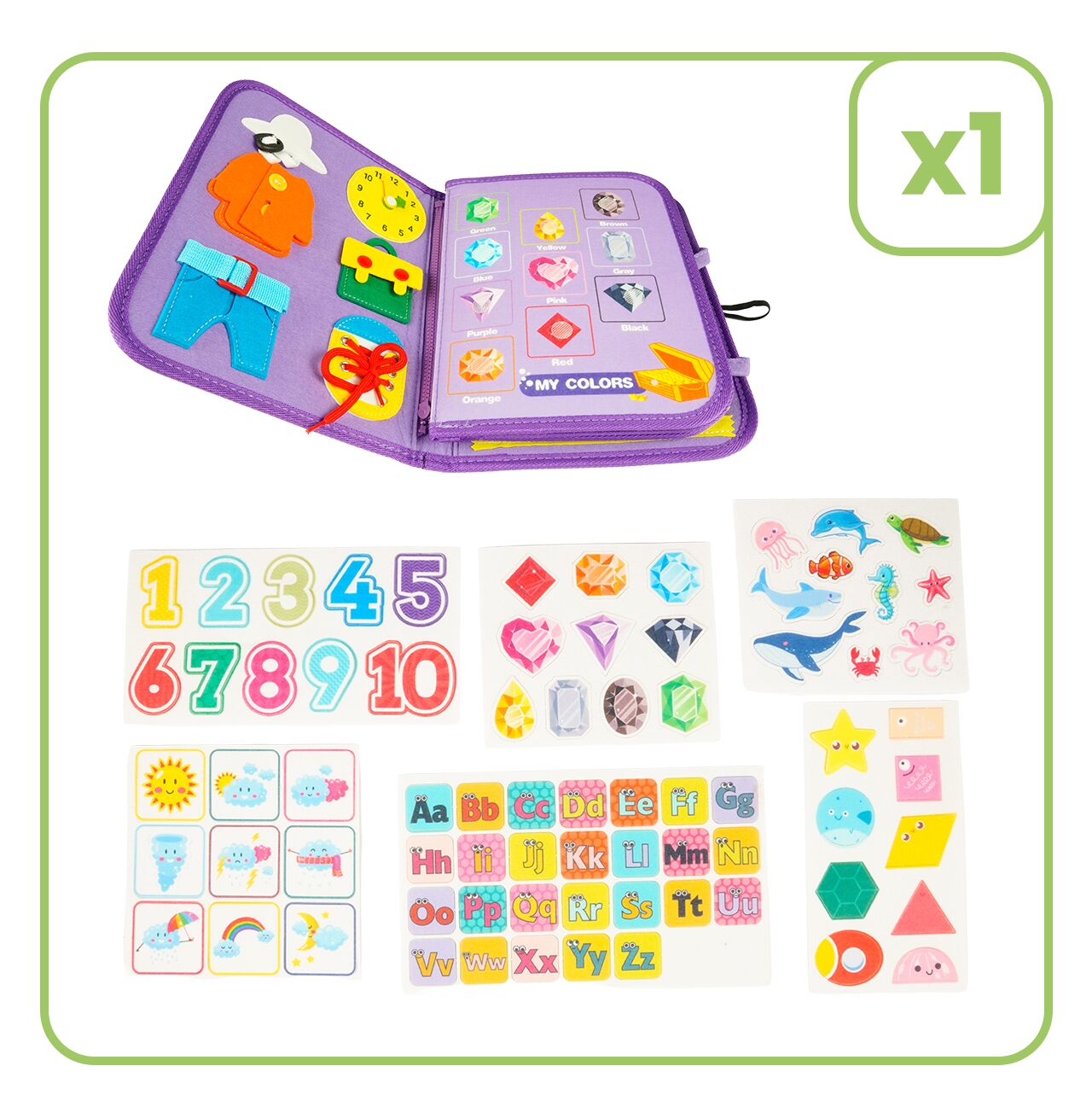 - Quiet book 8w1 – przebieranie postaci, zegar i sznurowanie, alfabet, liczby, kolory, kształty, pogoda, zwierzęta morskie, paski i klamry do zapinania.