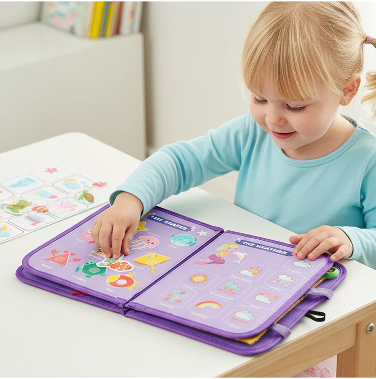 Na następnych stronach dziecko poznaje kształty i kolory – każdy element ma podpis i ciekawą, morską grafikę (gwiazdki, meduzy, muszelki, diamenty). Można prosić malucha o znalezienie konkretnego koloru lub kształtu, dopasowywanie par czy sortowanie elementów. Tuż obok znajduje się plansza z pogodą – słoneczko, chmurki, deszcz, tęcza. Razem z syrenką dziecko może codziennie „ustawiać” pogodę, którą widzi za oknem, ucząc się nowych słów.