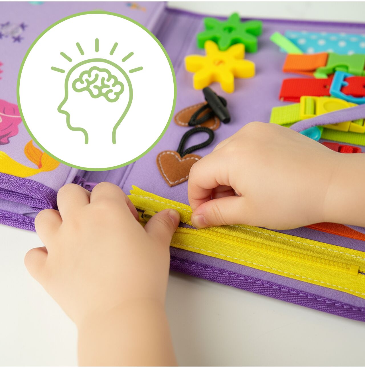 - Nauka przez zabawę – pierwsze cyfry, litery i pojęcia świata (pogoda, kształty, kolory) w formie barwnych, dotykowych zadań.