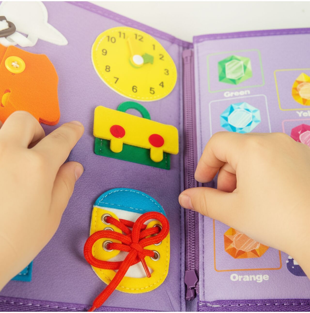 - Materiał: miękki filc + tkanina, elementy na rzepy, klamry, suwaki, sznurówki