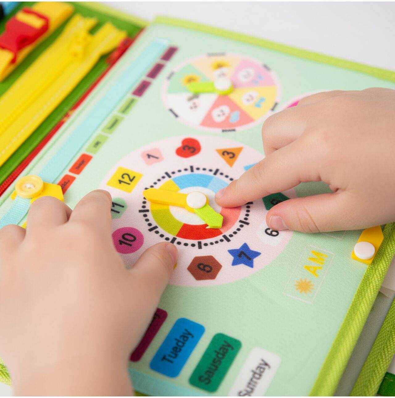 Na jednej ze stron znajduje się duży zegar oraz plansza z planem dnia. Dziecko może przesuwać wskazówki zegara i dopasowywać obrazki pokazujące kolejne aktywności: wstawanie, śniadanie, zabawę, obiad, kolację i sen. To świetny sposób, aby wytłumaczyć maluchowi, kiedy jemy, kiedy się bawimy, a kiedy jest pora spania. Zabawa w „układanie dnia” pomaga też lepiej znosić rutynę i uczy punktualności.