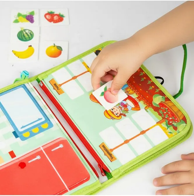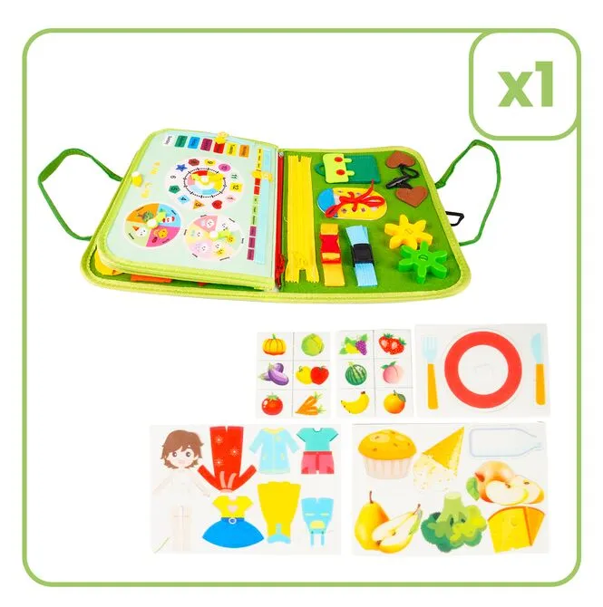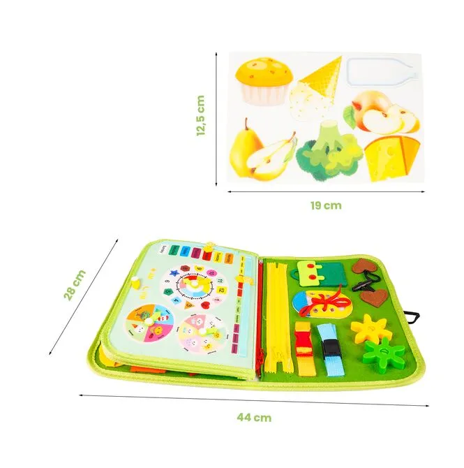 - Quiet book 6w1 – zegar i plan dnia, warzywa i owoce, kuchnia z lodówką i kuchenką, nakrywanie do stołu, ubieranie postaci, zdrowe jedzenie.