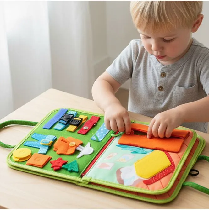 - Typ produktu: książeczka sensoryczna / quiet book w formie torebki