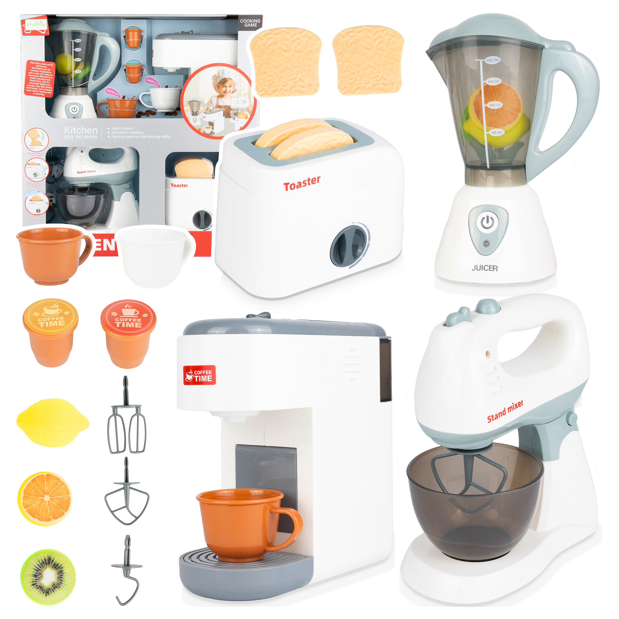 KUCHYŇSKÁ SADA MALÉ DOMÁCÍ SPOTŘEBIČE PRO DĚTI KÁVOVAR 4V1 TOPINKOVAČ MIXÉR MÍSA