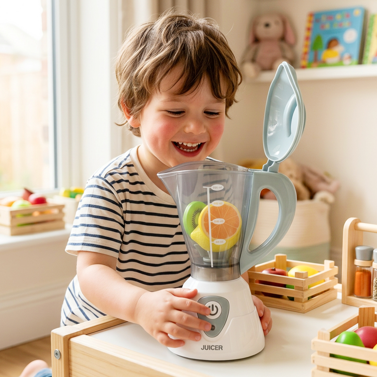 Sada obsahuje také mixér s džbánem , do kterého můžete vložit přiložené prvky imitující ovoce. Je to skvělý způsob, jak si užít zábavu při přípravě džusů, smoothies a zdravých nápojů. Průhledná nádoba navíc dodává celému výrobku velmi realistický a vizuálně atraktivní vzhled.