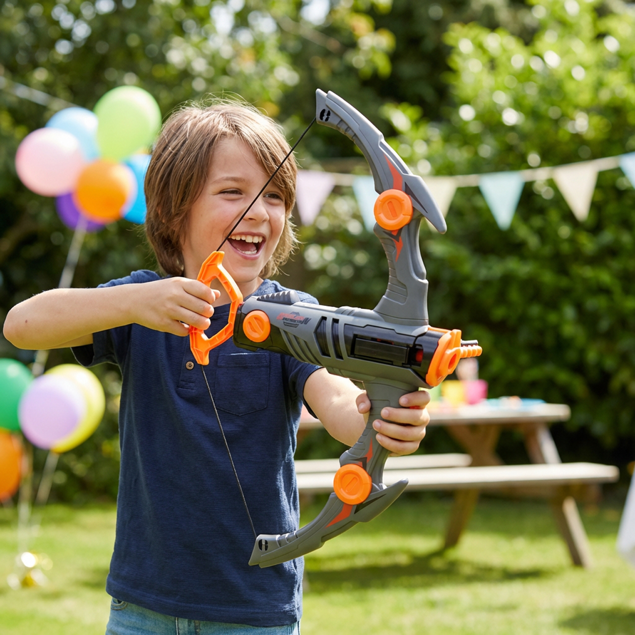 - Design 2 v 1: kuše + blaster – vypadá jako herní zařízení, od prvního okamžiku vytváří wow efekt