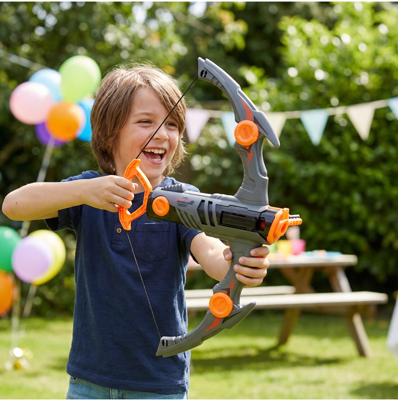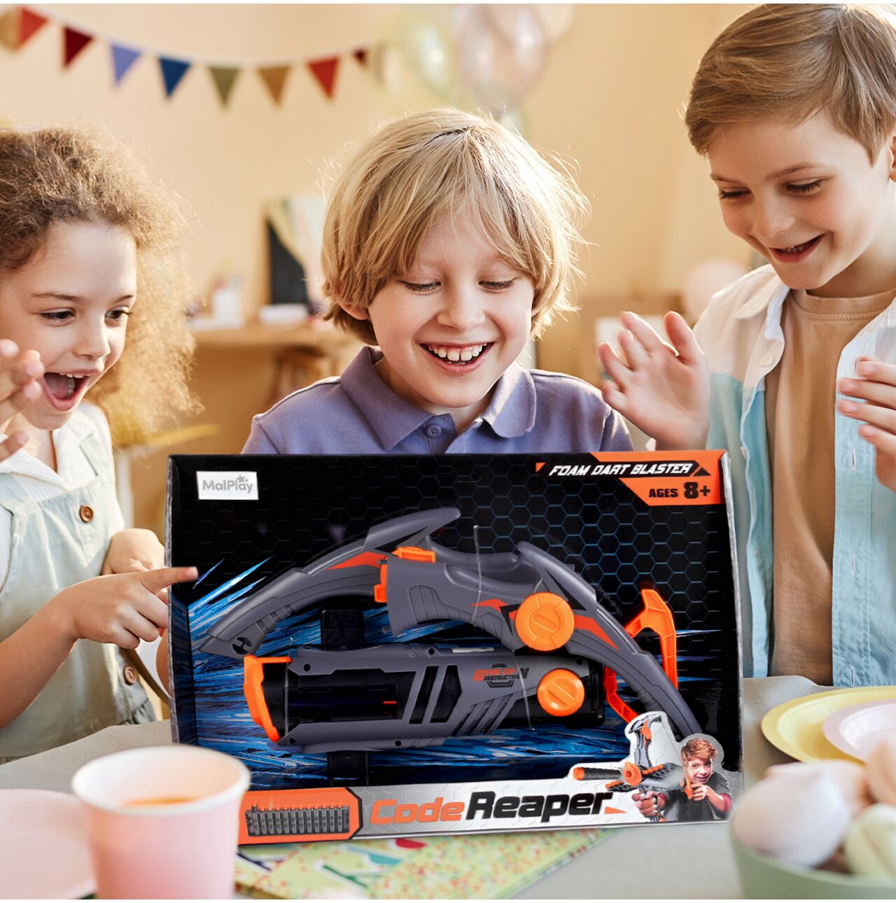 - Design 2 v 1: kuše + blaster – vypadá jako herní zařízení, od prvního okamžiku vytváří wow efekt