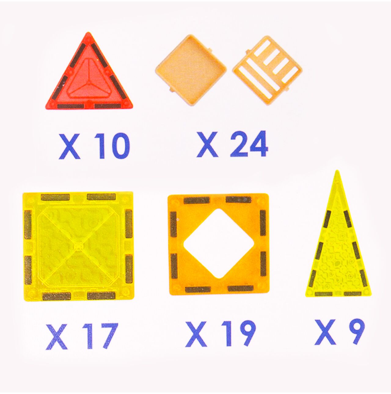 - Vysoký trojúhelník (rovnoramenný – „věž“) – 9 ks. (celkem 79 prvků; vícebarevné, poloprůhledné barvy)