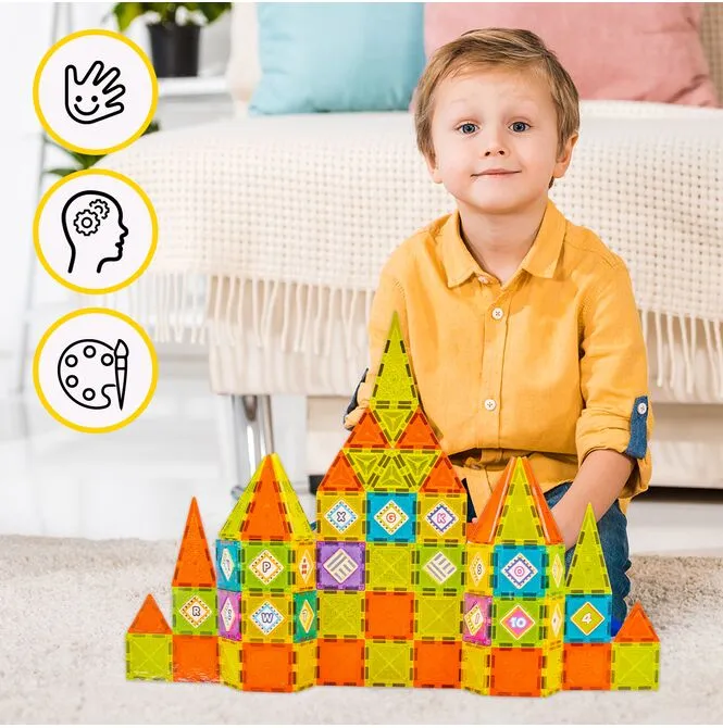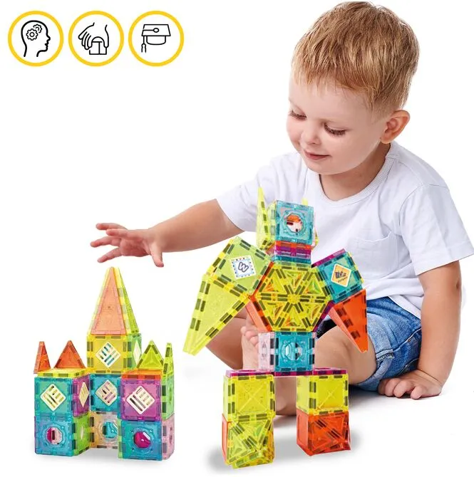 Stavění z magnetických dlaždic je čisté STEM učení v akci: děti si procvičují prostorové myšlení , geometrii , plánování a řešení problémů (stabilita, symetrie). Manipulace s dílky posiluje jemnou motoriku a koordinaci ruka-oko , zatímco vkládání písmen a číslic učí čtení a počítání přirozenou a hravou formou. Společné projekty podporují spolupráci a komunikaci .