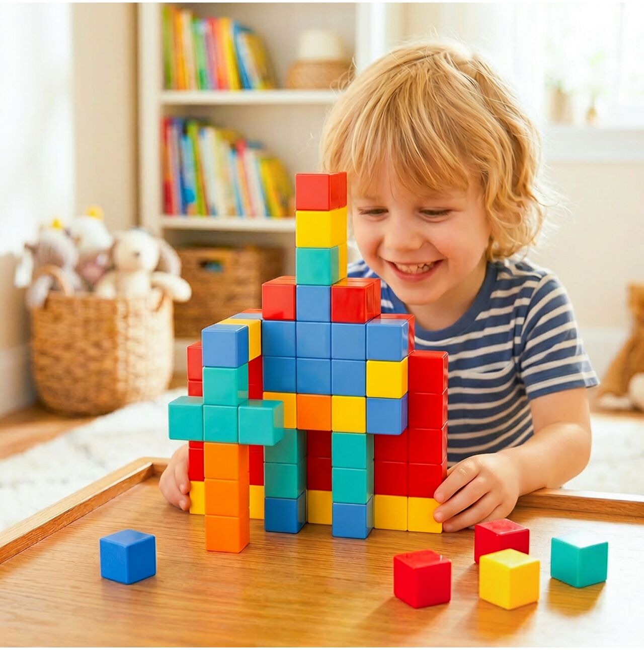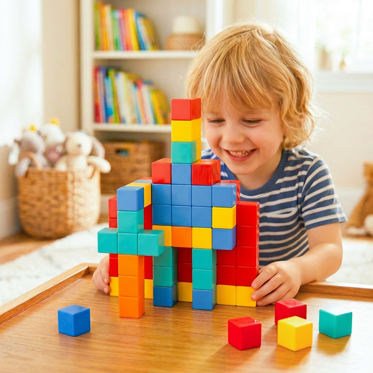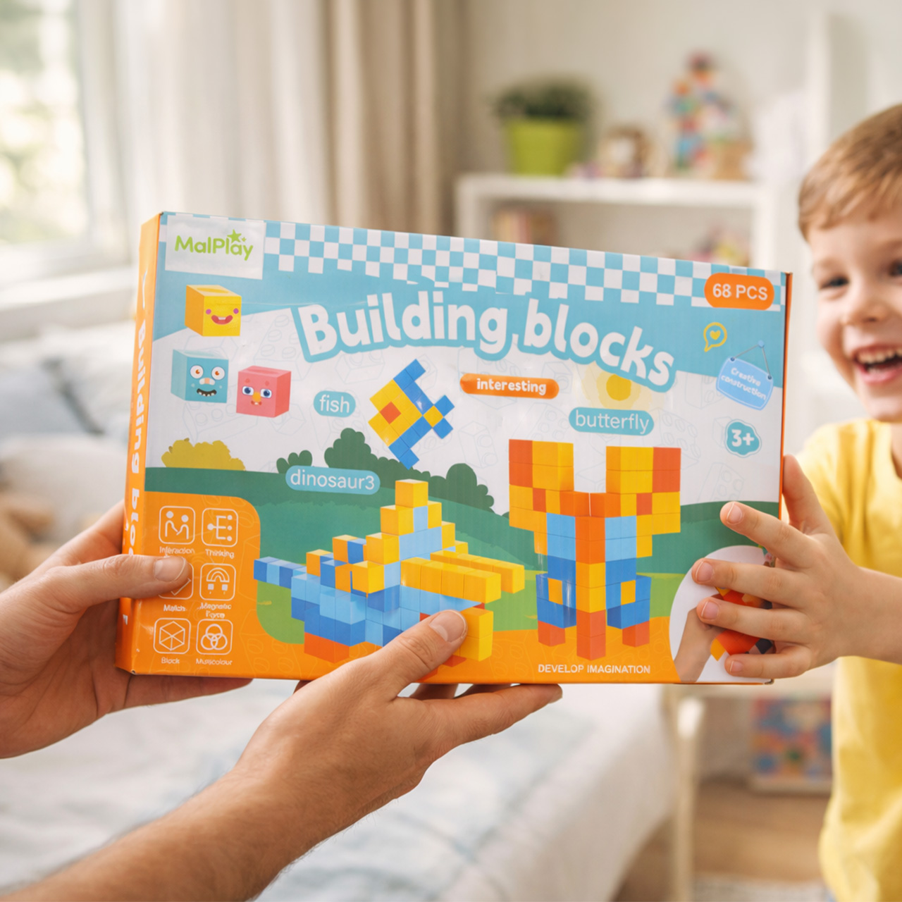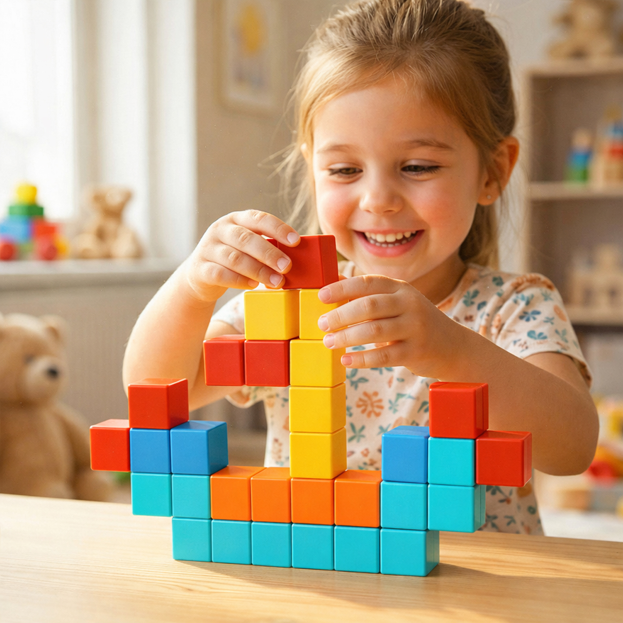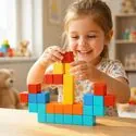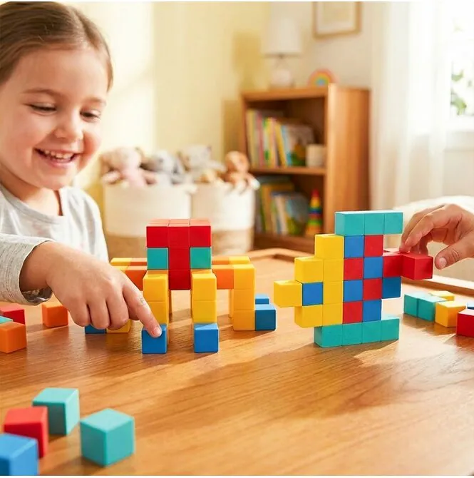 Během hry děti nejen skládají kostky, ale také plánují, porovnávají, experimentují, vylepšují a kontrolují, co se lepí a co je třeba změnit. V praxi to znamená rozvíjet koordinaci ruka-oko, manuální zručnost, prostorové vnímání a logické myšlení . Patří sem také učení se barev, vytváření symetrie a rozvíjení prvních představ o struktuře. Toto je skvělý příklad hračky, která poskytuje zábavu tady a teď a zároveň přispívá k rozvoji dítěte – bez vtíravého „vzdělávání v reklamě“.