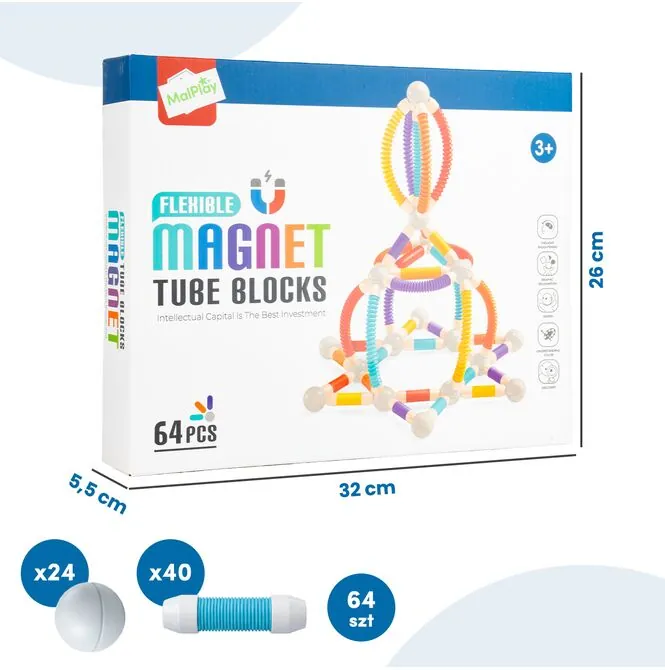 NejvětšíNejvětší výhodou této sady jsou flexibilní magnetické trubice, které lze nejen ohýbat, ale také natahovat a přizpůsobovat vlastnímu designu. Tato vlastnost odlišuje hračku od klasických stavebnic. Děti si mohou vytvářet oblouky, tunely, kruhy a neobvyklá spojení , díky čemuž jsou stavby zajímavější a poskytují více kreativních možností. Tento produkt stimuluje fantazii, protože nevnucuje jediný herní vzorec.
