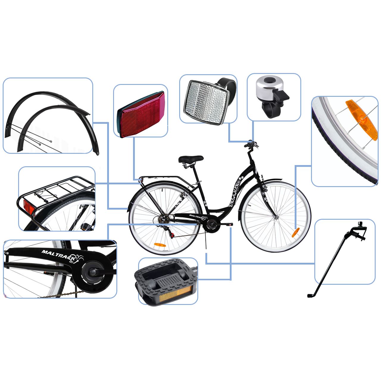 SVĚTLA | KUFR | REFLEXNÍ | BLATNÍKY | NOHA | ZVON | PROTISKLUZOVÉ RUKOJETI | KRYT ŘETĚZU | POHODLNÉ SEDLO | PEDÁLY PLATFORMY | 6 PŘEVODŮ