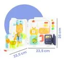 Otevírací dvířka a pohyblivé uzávěry povzbuzují batolata k manipulaci s prvky a objevování skrytých ilustrací. Je to skvělý způsob, jak rozvíjet zvědavost, obratnost prstů a koordinaci ruka-oko.