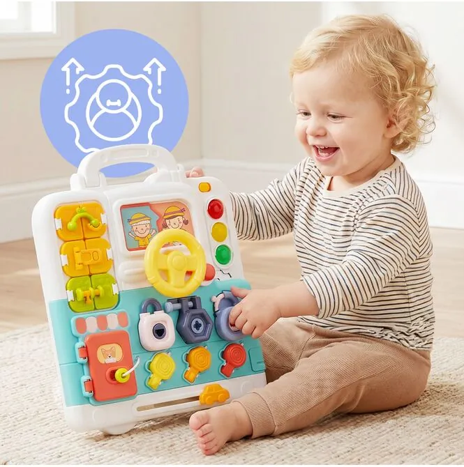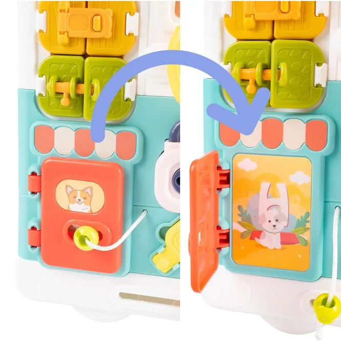 Po rozložení se hrací deska promění v komplexní centrum aktivit s mnoha prvky, které lze posouvat, otevírat, otáčet a mačkat . To dětem umožňuje prozkoumávat různé mechanismy a procvičovat si soustředění při hraní.