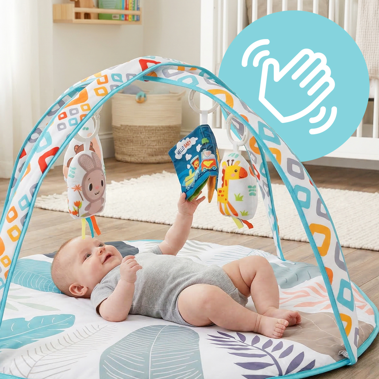 Nad matą umieszczono kolorowe, miękkie zawieszki z motywami zwierzątek oraz materiałową książeczkę. Dzięki nim dziecko może ćwiczyć skupianie wzroku, sięganie, chwytanie i poznawanie nowych kształtów. Różnorodne elementy sprawiają, że mata nie jest tylko miejscem do leżenia, ale aktywną strefą zabawy.