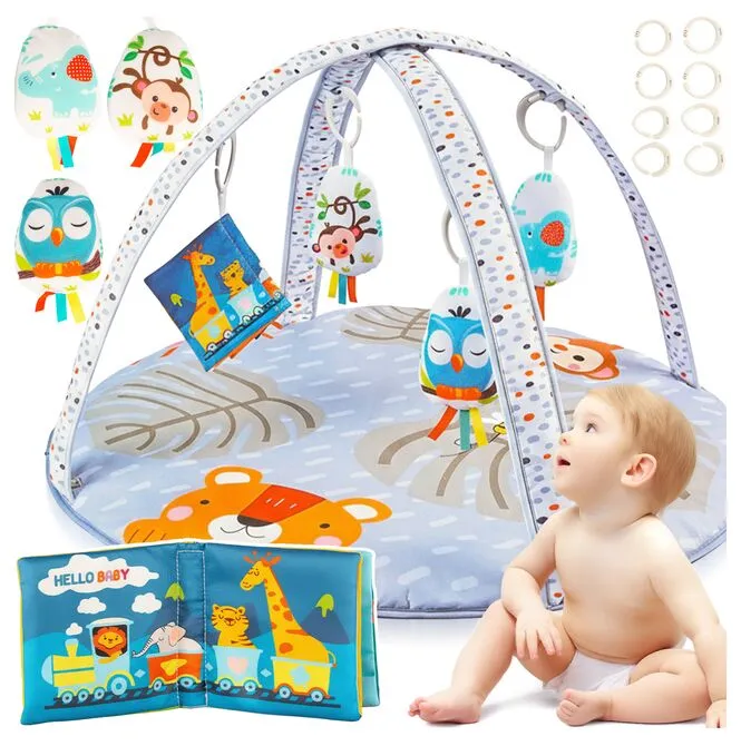 Na pałąkach zawieszone są pluszowe zwierzątka i miękka książeczka. Każda zabawka ma inny wzór. Maluszek ćwiczy koordynację wzrokowo–ruchową, próbuje chwytać, przyciągać do siebie i poznaje związki przyczynowo–skutkowe („dotykam – zabawka się rusza”). Takie aktywności to ważny krok w rozwoju dłoni i paluszków.