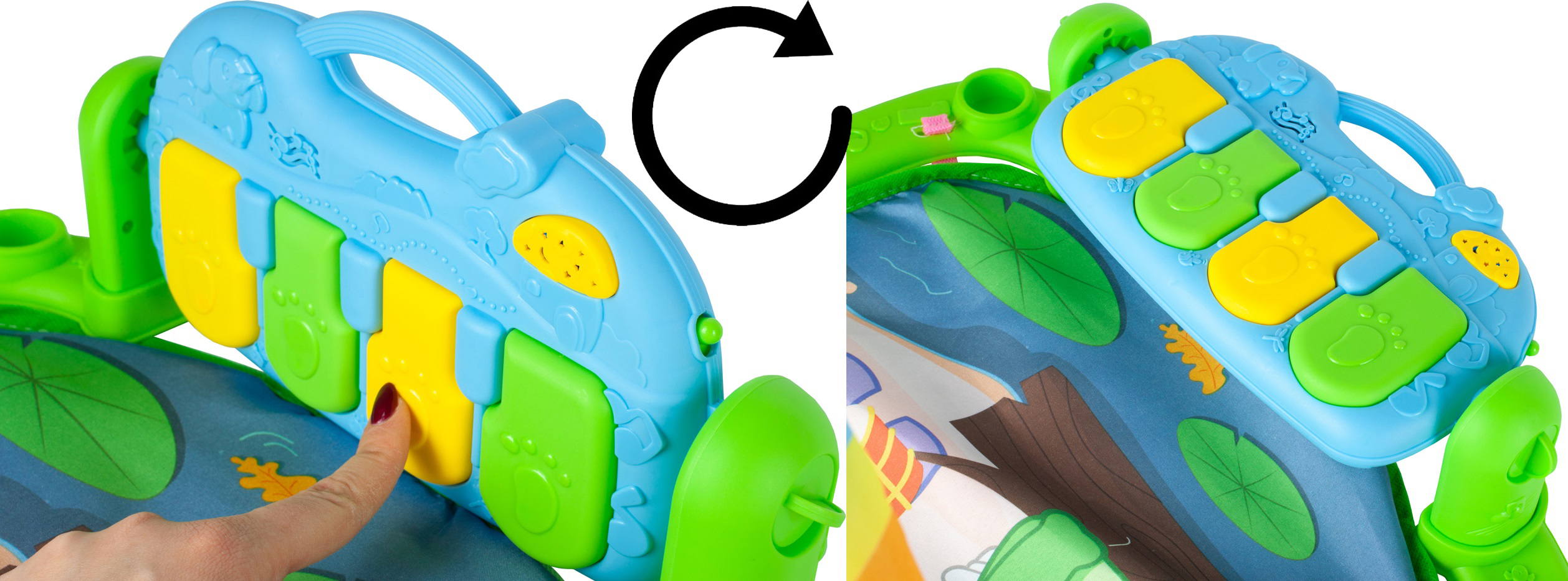 -pierwszy: pałąk montujemy pionowo nad matą, pianinko prostopadle do maty, tak by dziecko poruszając stopami uderzało w klawisze pianinka uruchamiając radosne dźwięki i światła, dziecko leżąc na plecach może bawić się zawieszonymi na pałąku grzechotkami,