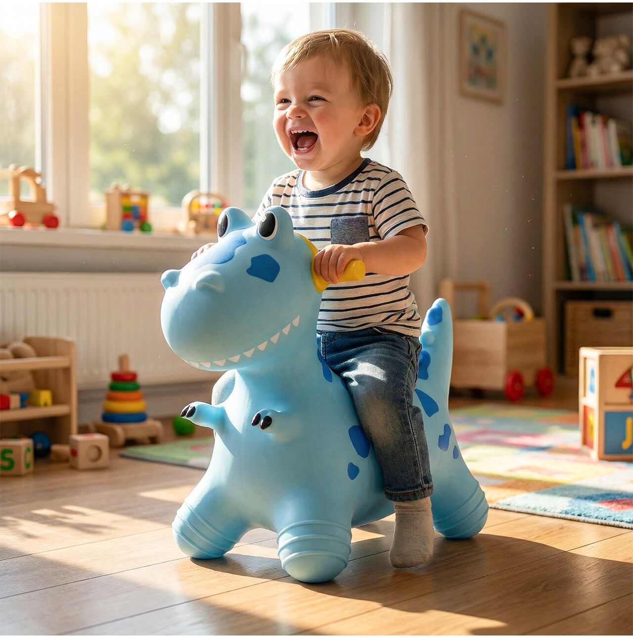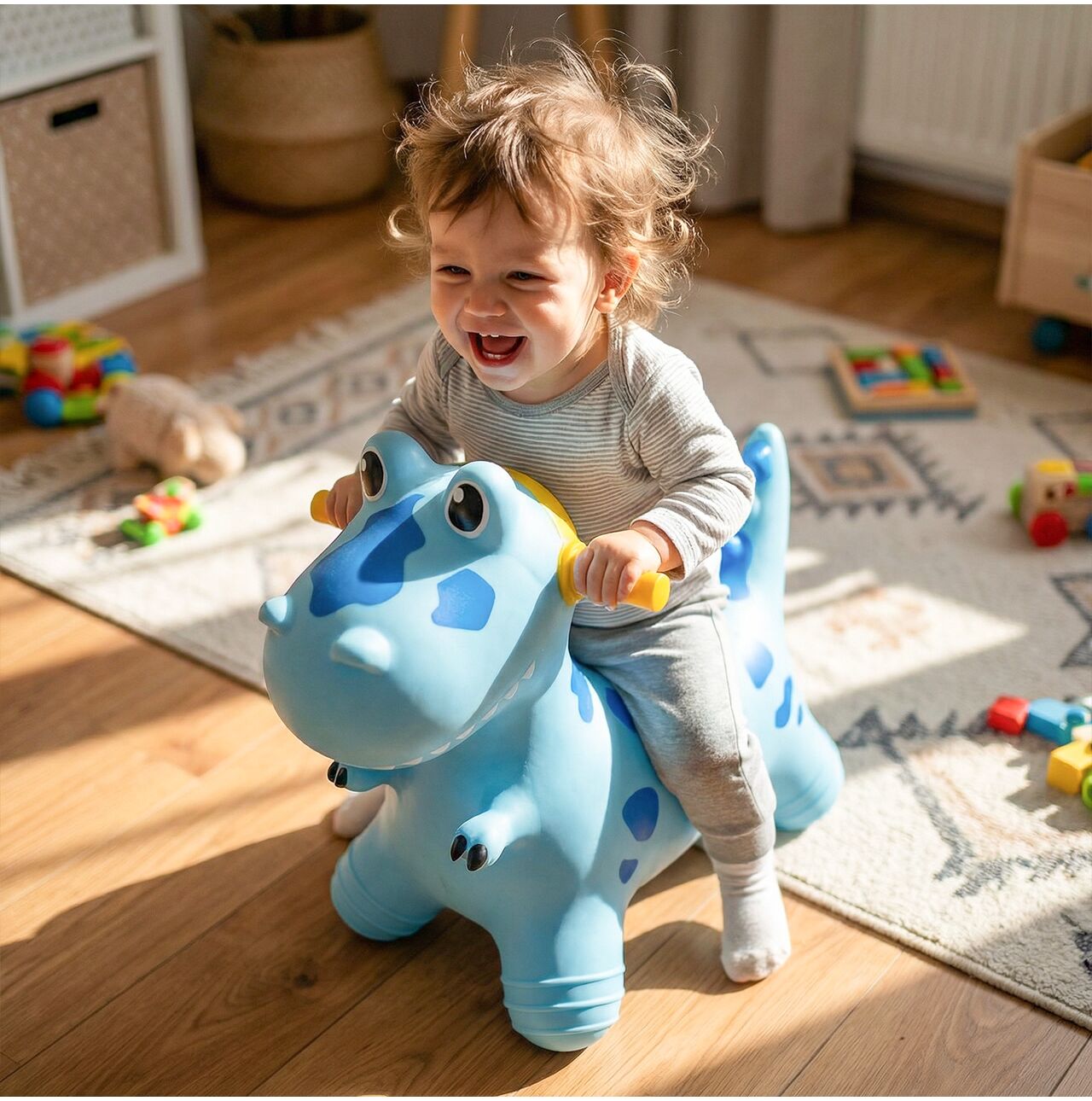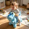 Dinosaurus je navržen tak, aby děti mohly pohodlně sedět a bezpečně se ho držet při hraní. Boční rukojeti pomáhají zajistit bezpečný úchop při skákání a odrážení, což dává vašemu dítěti lepší kontrolu. Tvar celé hračky rychle posiluje sebevědomí a povzbuzuje děti k dalším jízdám.
