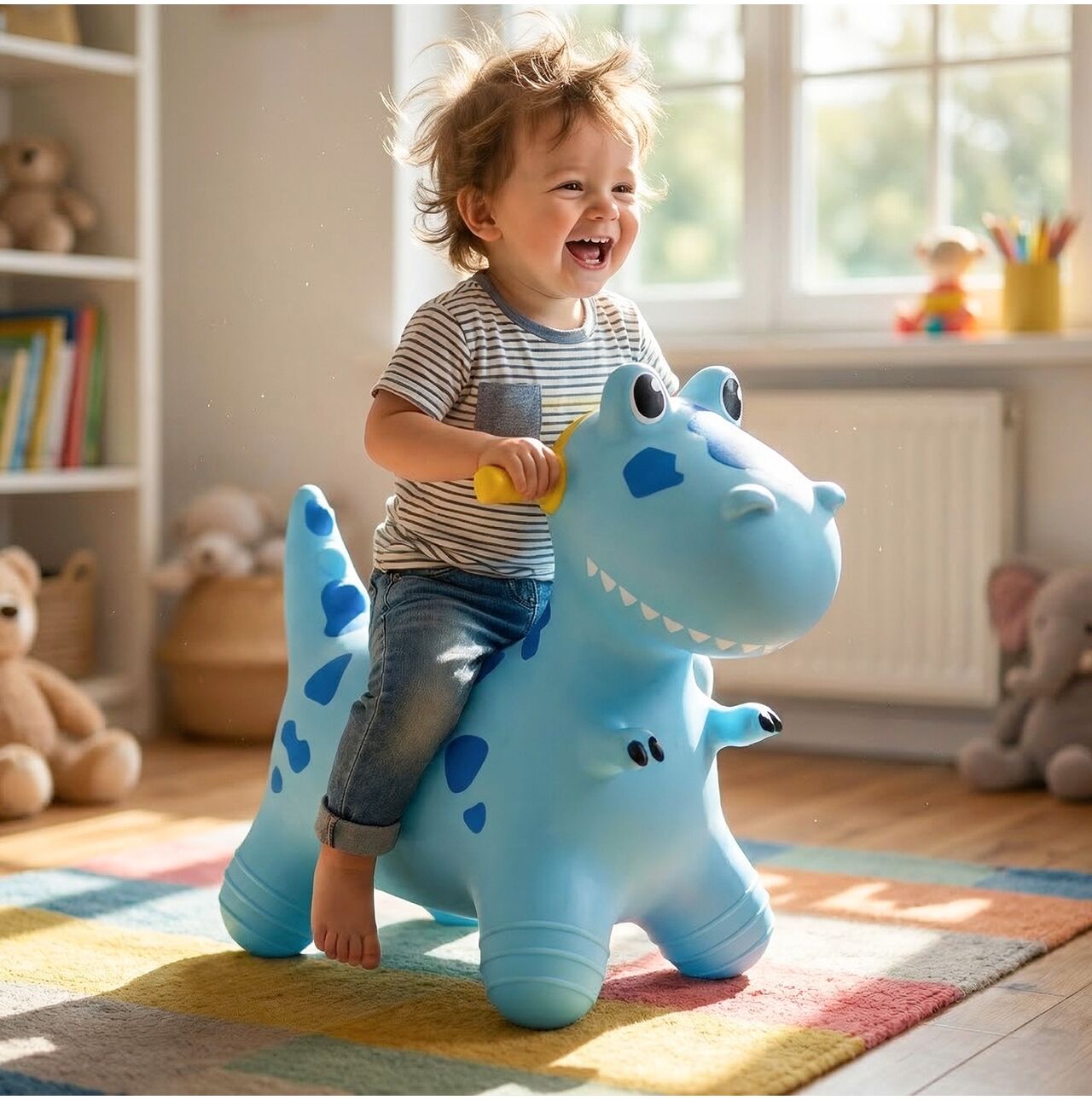 Dítě nedostane anonymní skákací hračku, ale vlastního dinosaura s pohodlným sedátkem, na kterém si může organizovat závody, expedice a každodenní projížďky po místnosti. Právě tento vzhled nejvíce stimuluje fantazii a dítě si k hračce mnohem více připoutá. Dinosaurus vypadá přátelsky, atraktivně a okamžitě vás vybízí k jízdě.