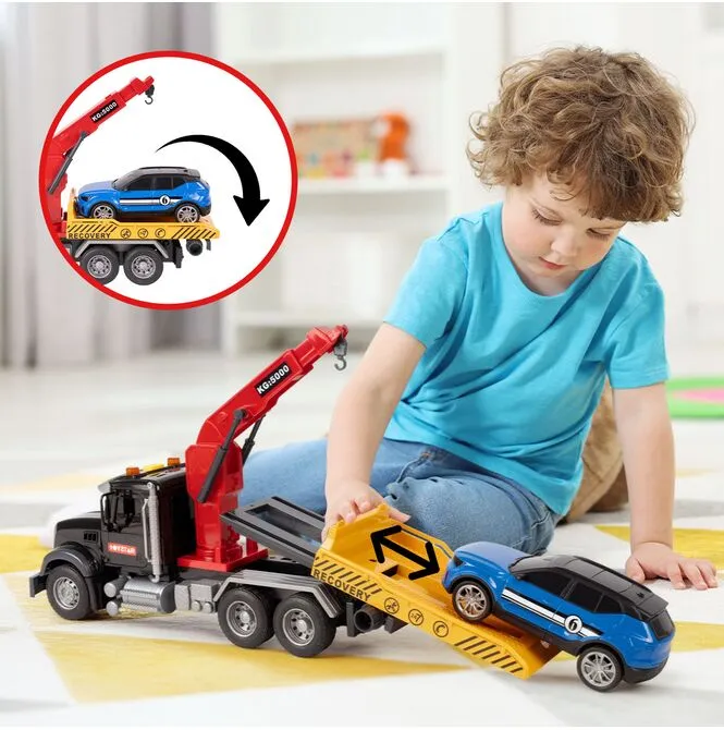 Toto odtahové vozidlo s pohyblivým jeřábem a výsuvnou rampou umožňuje autentické hraní: zvedání, nakládání a přepravu. Světla a zvuky ovládané tlačítky umocňují vzrušení – ideální, když hledáte odtahové vozidlo pro děti s efekty a „skutečným“ pocitem.