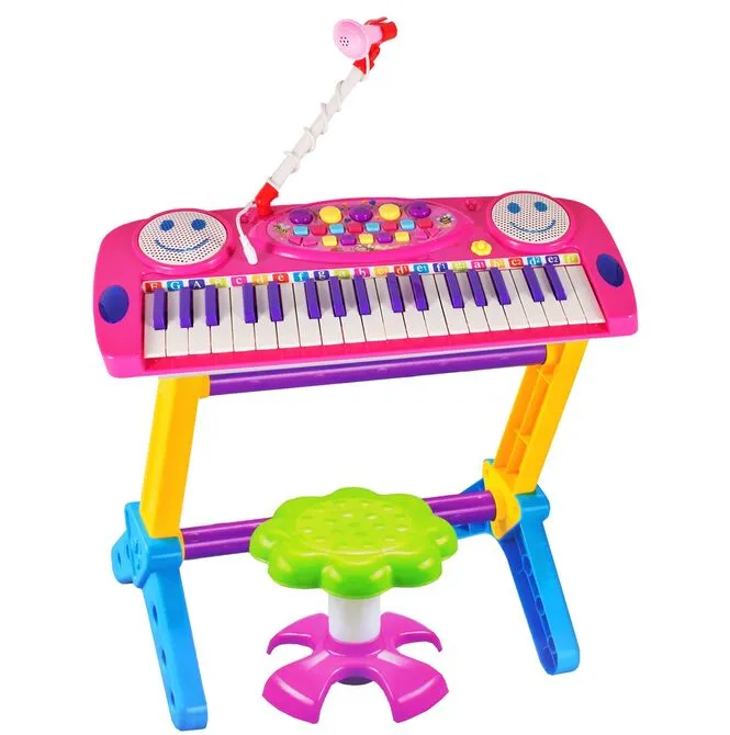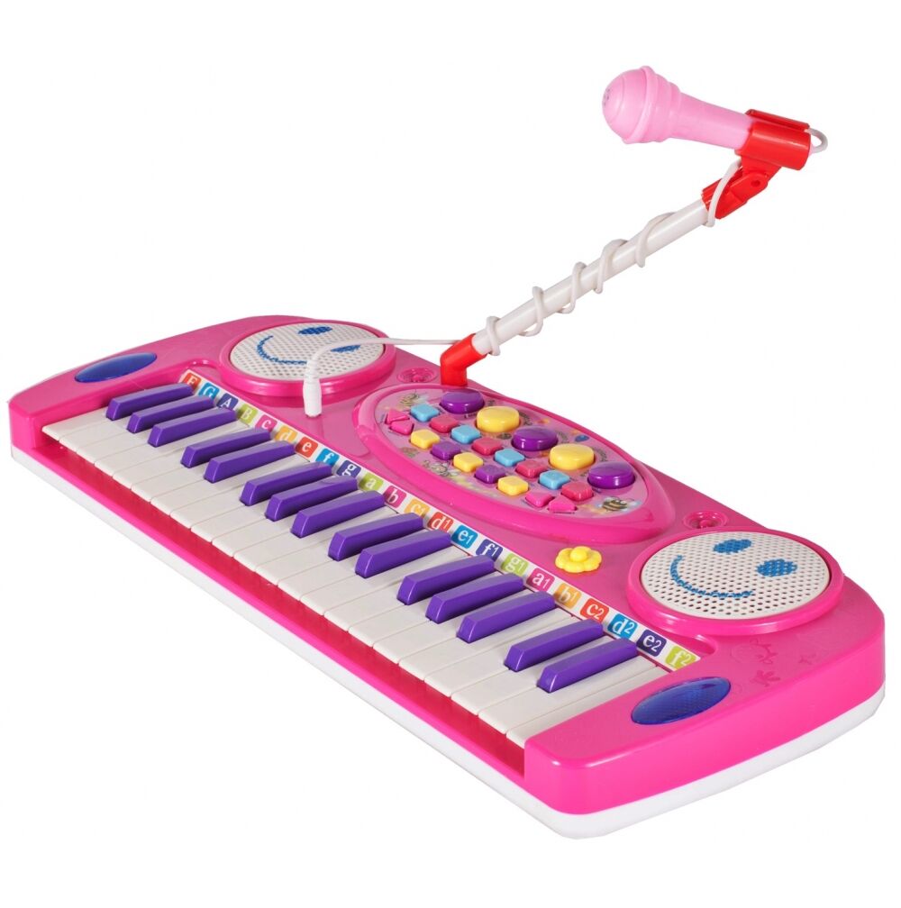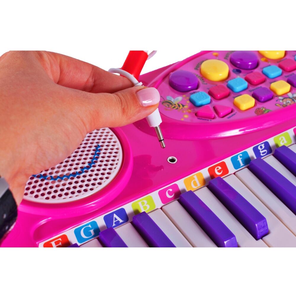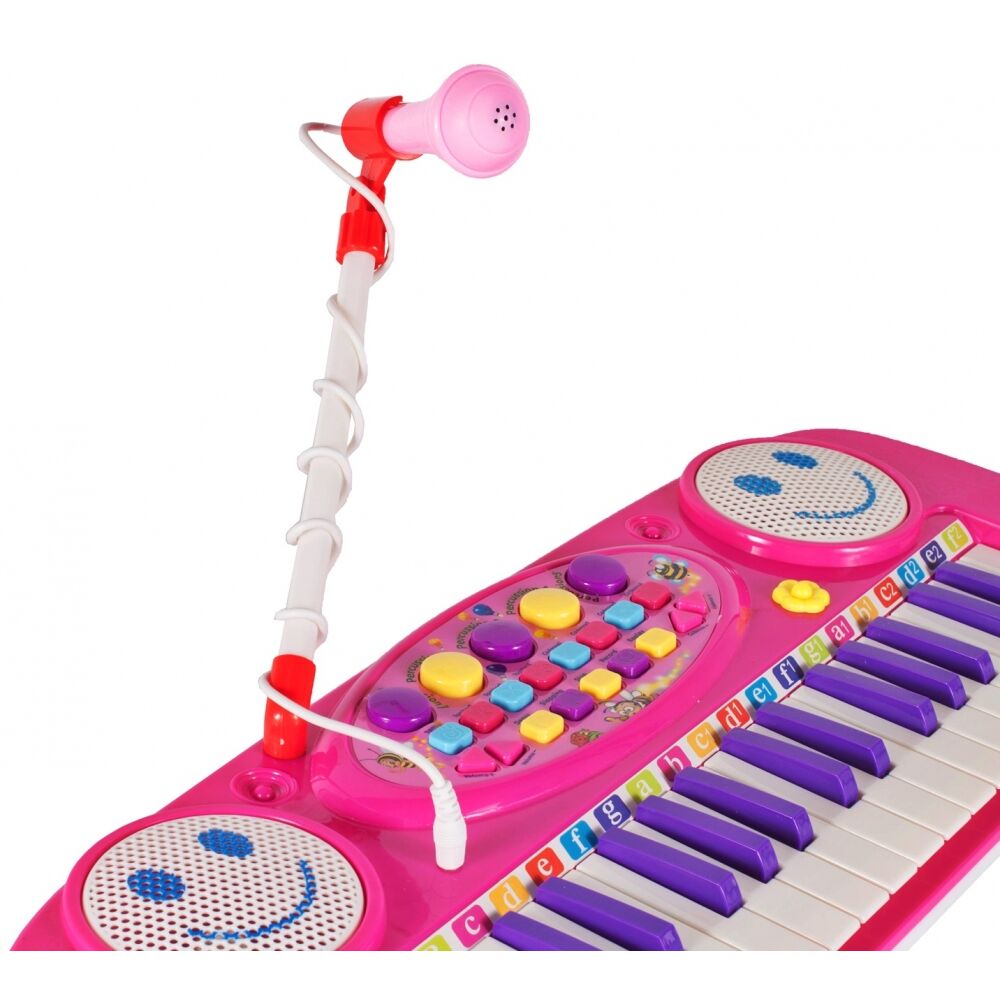 Posiada zintegrowany układ mikrokomputera, głośniki stereo, wysokiej jakości tony i miękkie dźwięki. Zabawna klawiatura z 37 klawiszami fortepianu, mikrofonem i stołkiem: dziecko może śpiewać podczas gry!