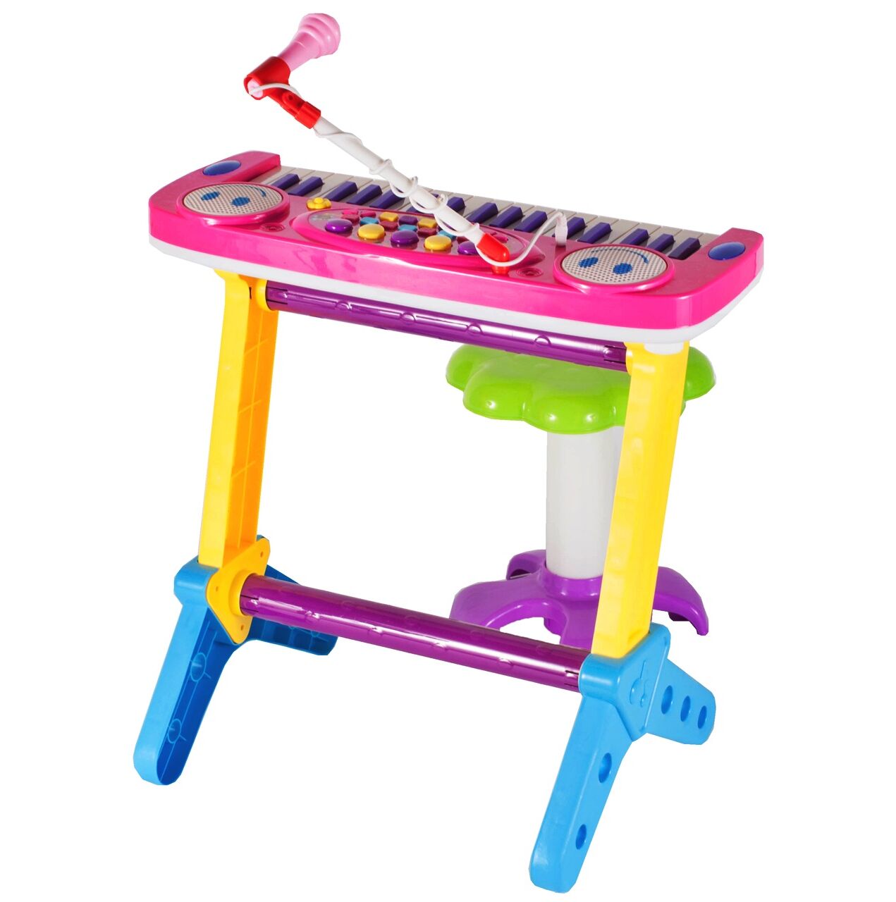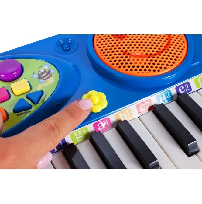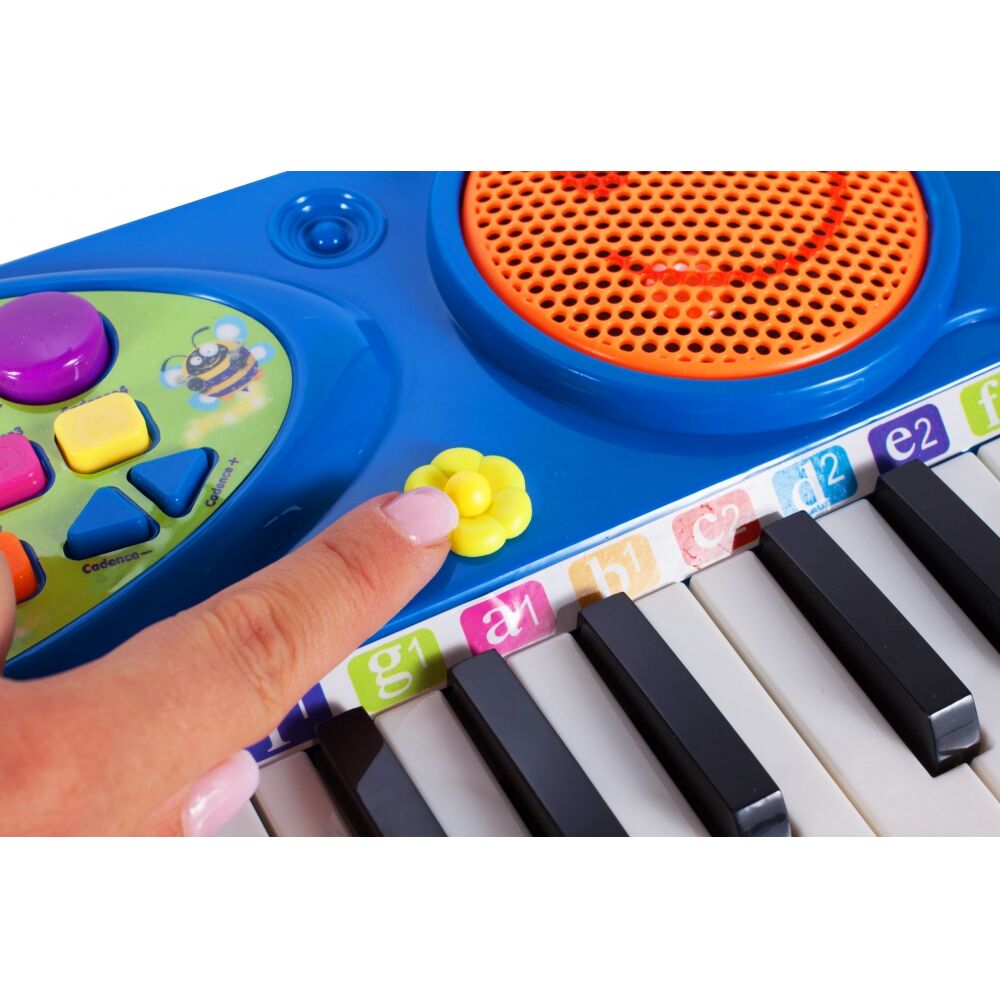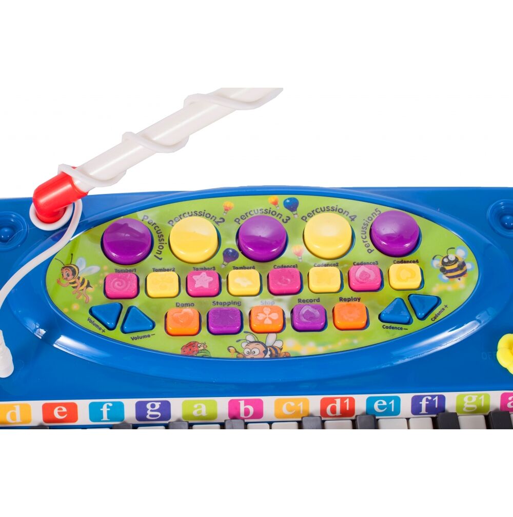 Posiada zintegrowany układ mikrokomputera, głośniki stereo, wysokiej jakości tony i miękkie dźwięki. Zabawna klawiatura z 37 klawiszami fortepianu, mikrofonem i stołkiem: dziecko może śpiewać podczas gry!
