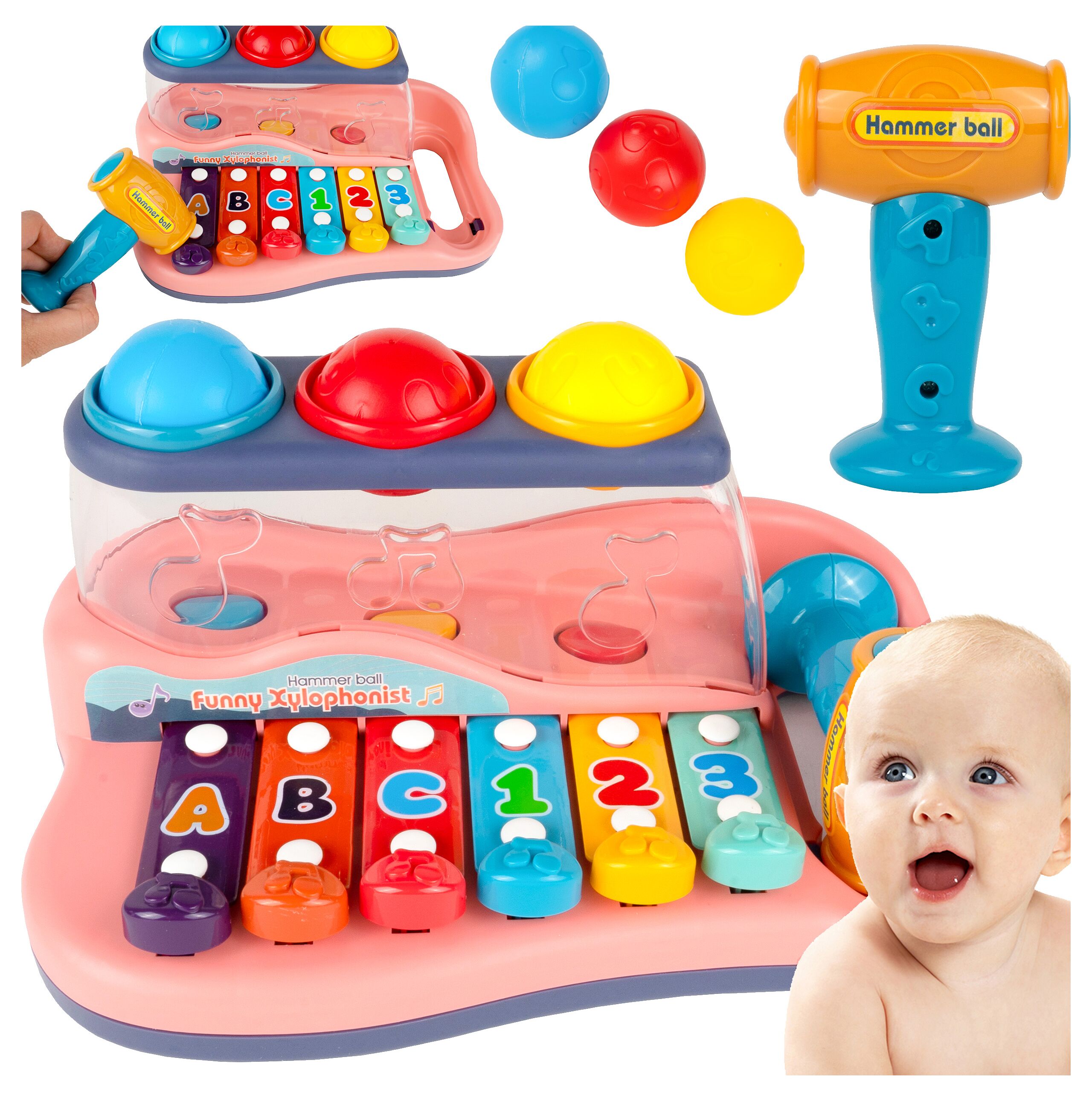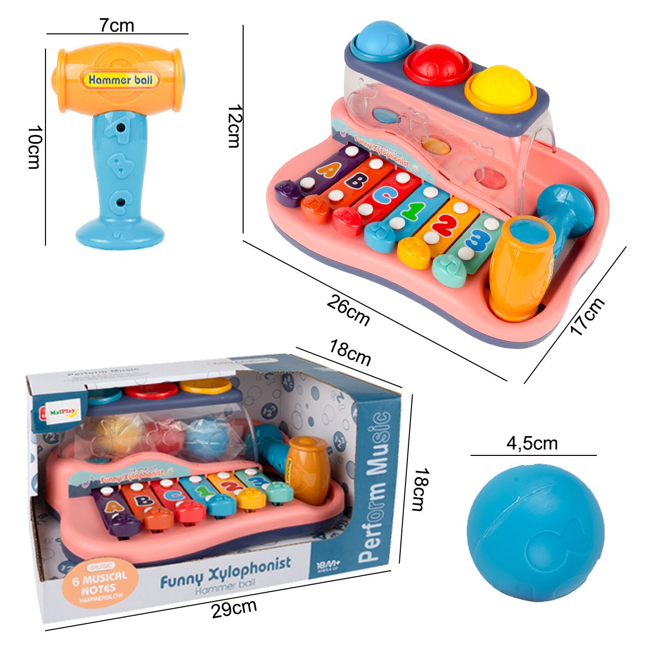 Das Set enthält 3 Bälle in verschiedenen Farben , die, wenn sie mit einem Hammer getroffen werden, Ihr Kind mit verschiedenen Soundeffekten unterhalten, und wenn sie seitlich in die Rinne fallen, animieren sie Ihr Kind zum Weiterspielen.