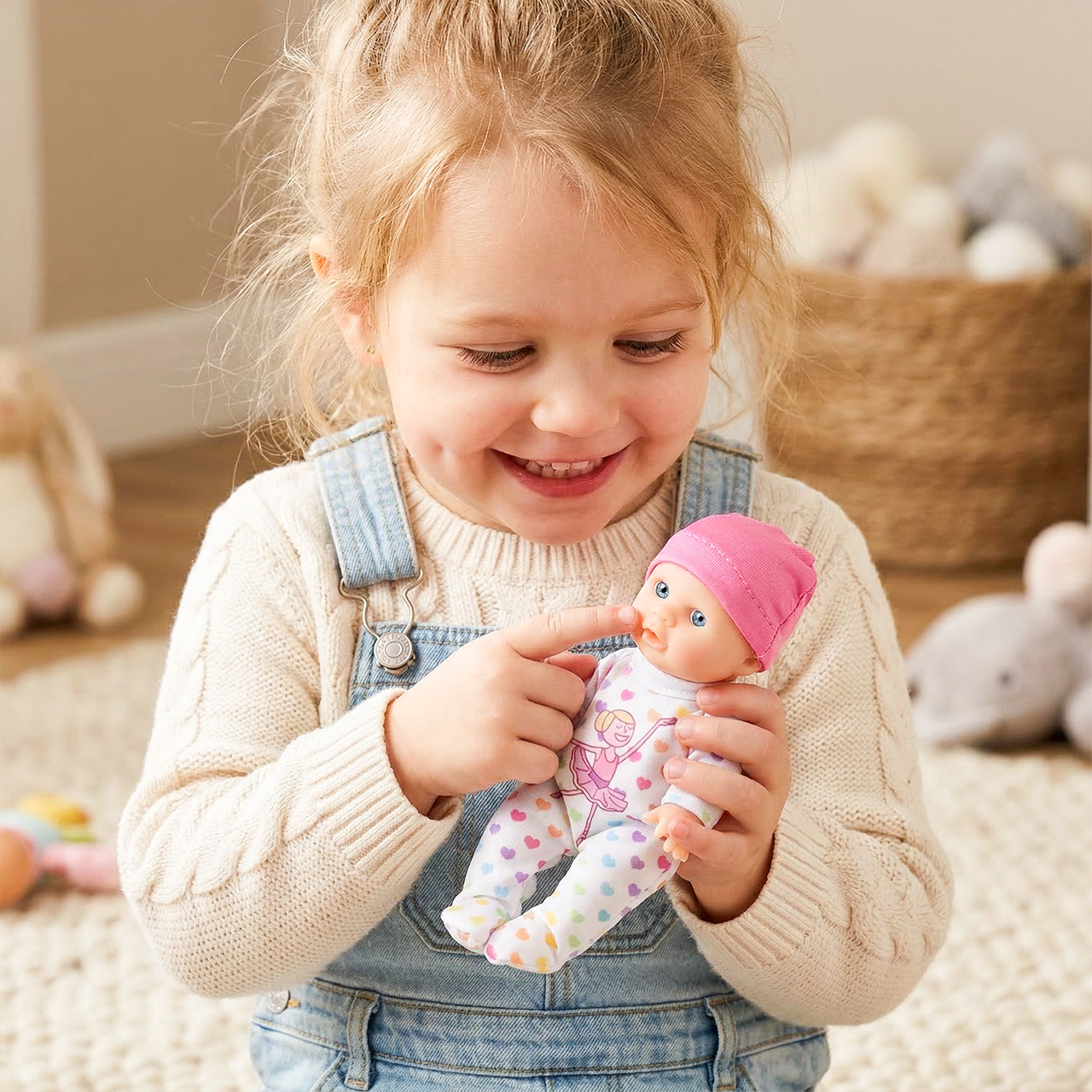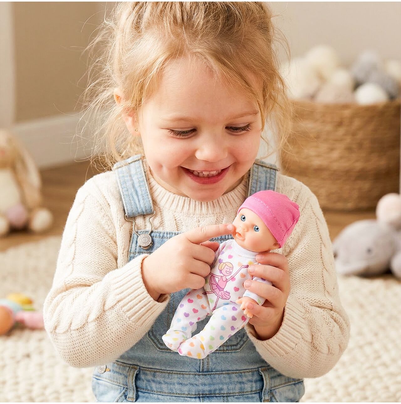 Kouzlo této panenky spočívá v její jednoduchosti a hřejivém, dětském vzhledu. Růžový klobouk, jemná tvářička a sladké oblečení okamžitě evokují asociace s péčí, blízkostí a bezpečnou hrou. Je to skvělá volba pro dítě, které si rádo mazlí s hračkami a vytváří s nimi každodenní rituály.