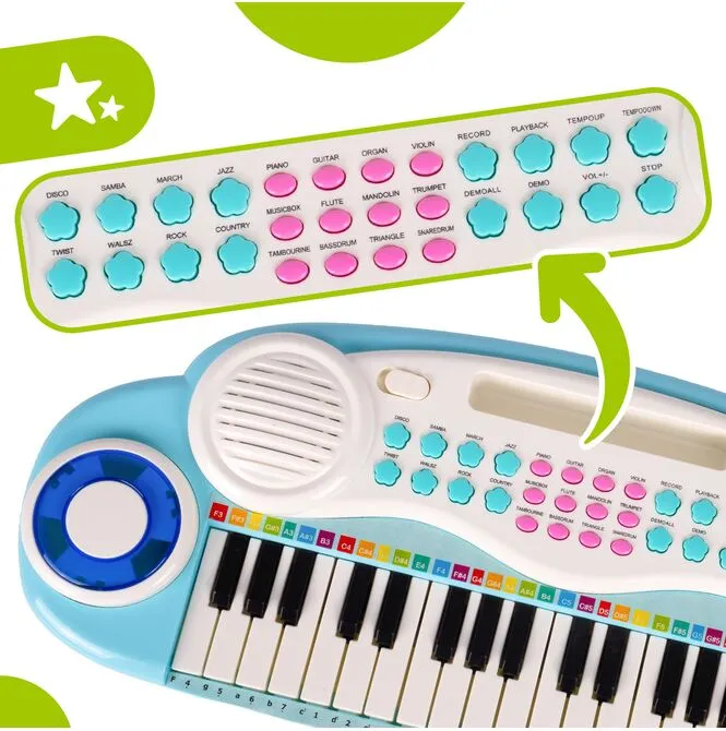 - klawiatura: dziecięca, wygodny skok klawiszy (z oznaczeniami nut)