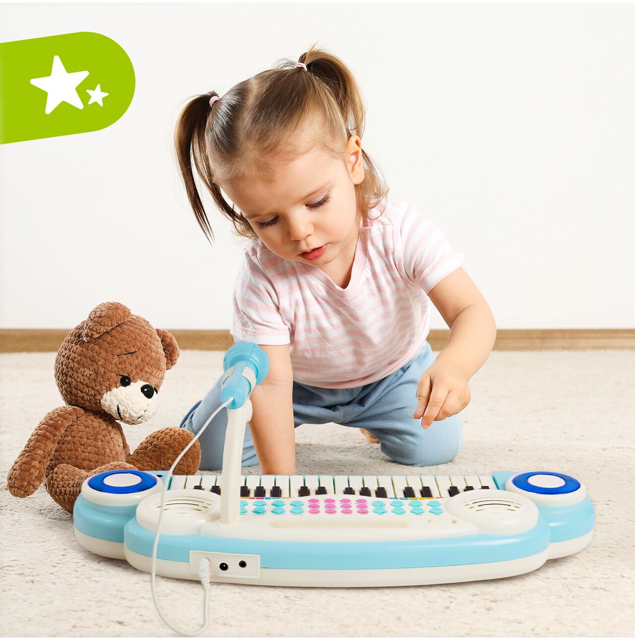 Pianinko uczy poprzez działanie: dziecko ćwiczy koordynację ręka-oko, słuch wysokościowy, poczucie rytmu i pamięć muzyczną. Nagrywanie własnych pomysłów wzmacnia kreatywność i pewność siebie, a wspólne śpiewanie do mikrofonu rozwija mowę i dykcję. Dzięki regulacji tempa i oznaczeniom dźwięków maluch łatwiej uczy się pierwszych melodii i literatury dziecięcej.