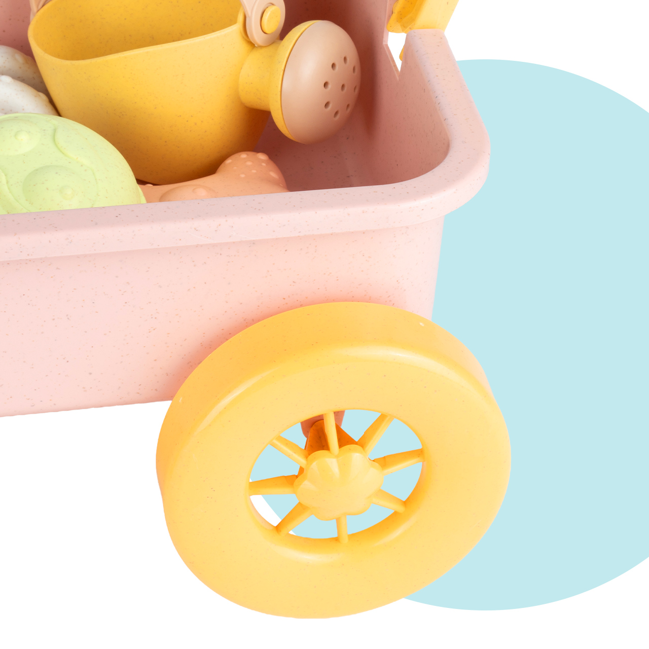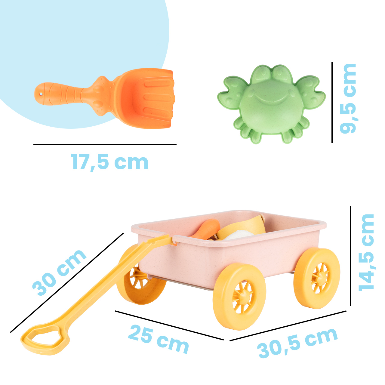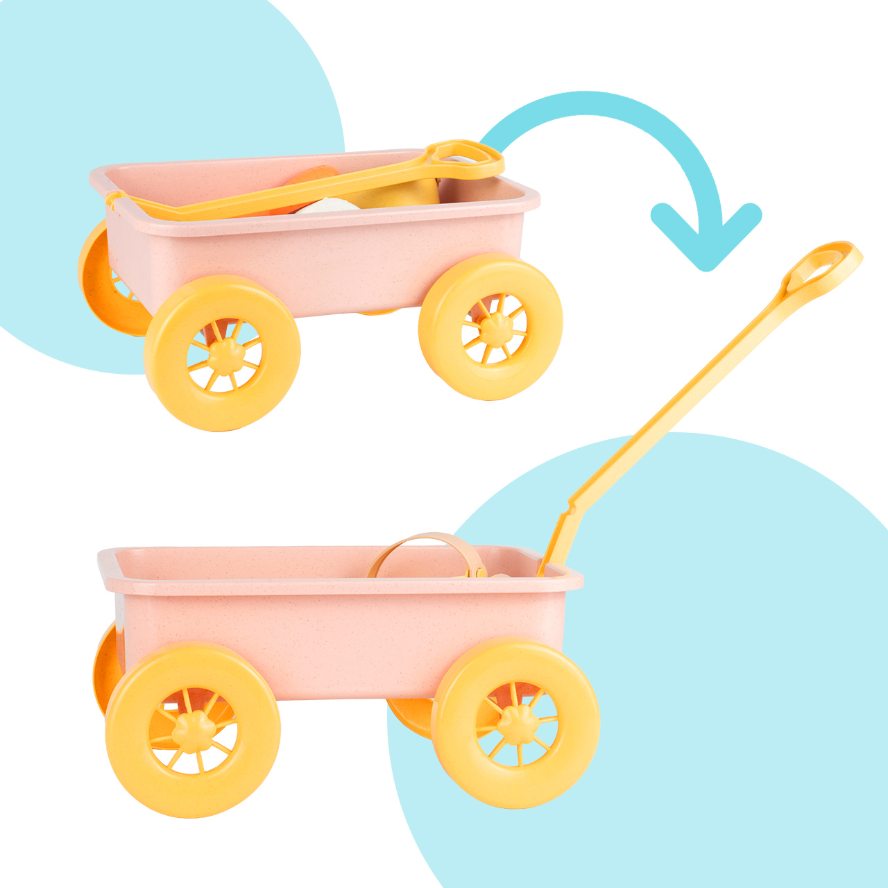 Děti milují hračky, s nimiž mohou dělat víc než jen držet. Dlouhá rukojeť a velká kola znamenají, že malí mohou vozík samostatně táhnout po písku, trávě nebo hřišti. To umožňuje více pohybu, větší nezávislost a více zábavy než tradiční kyblík nošený v ruce.