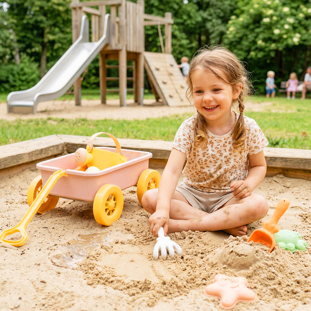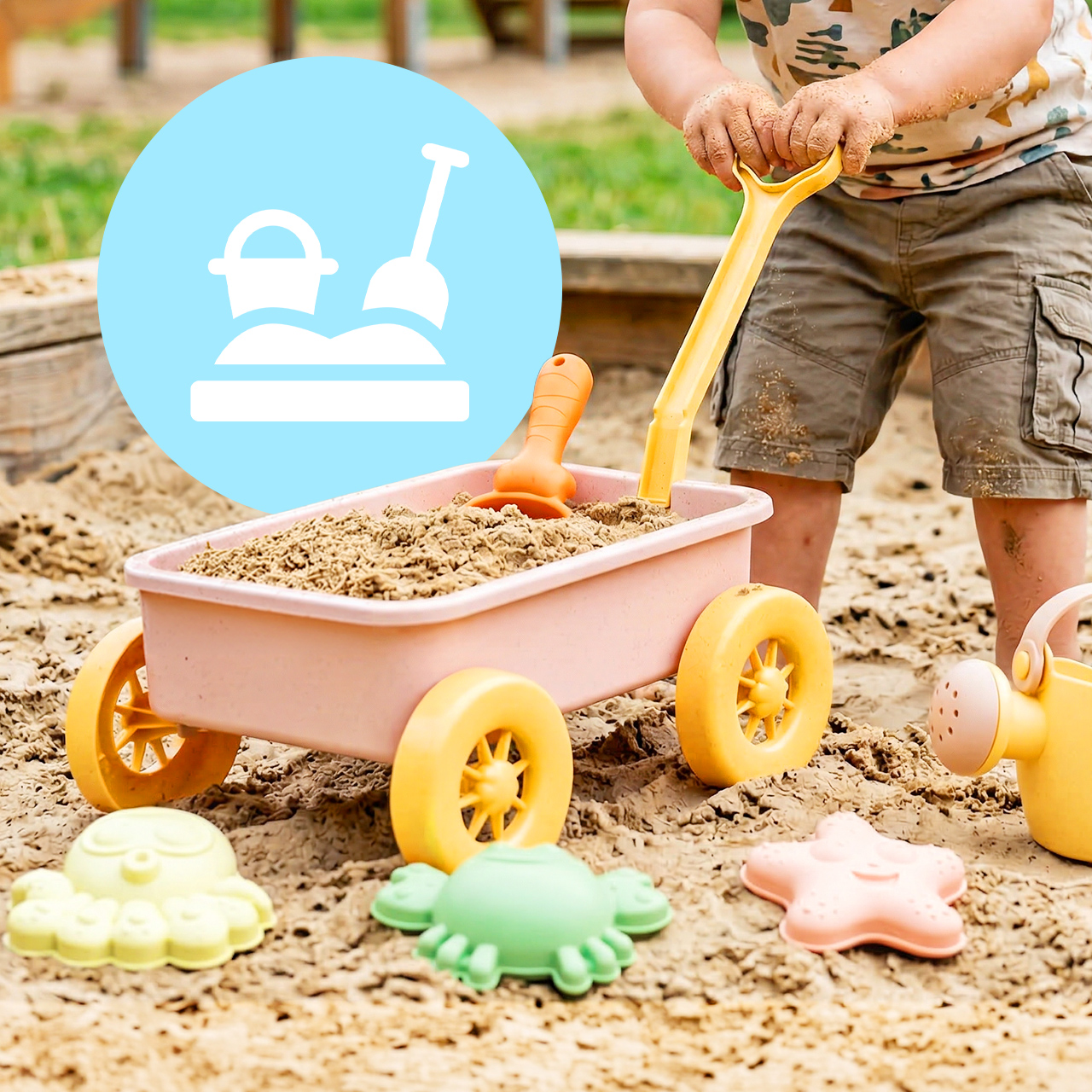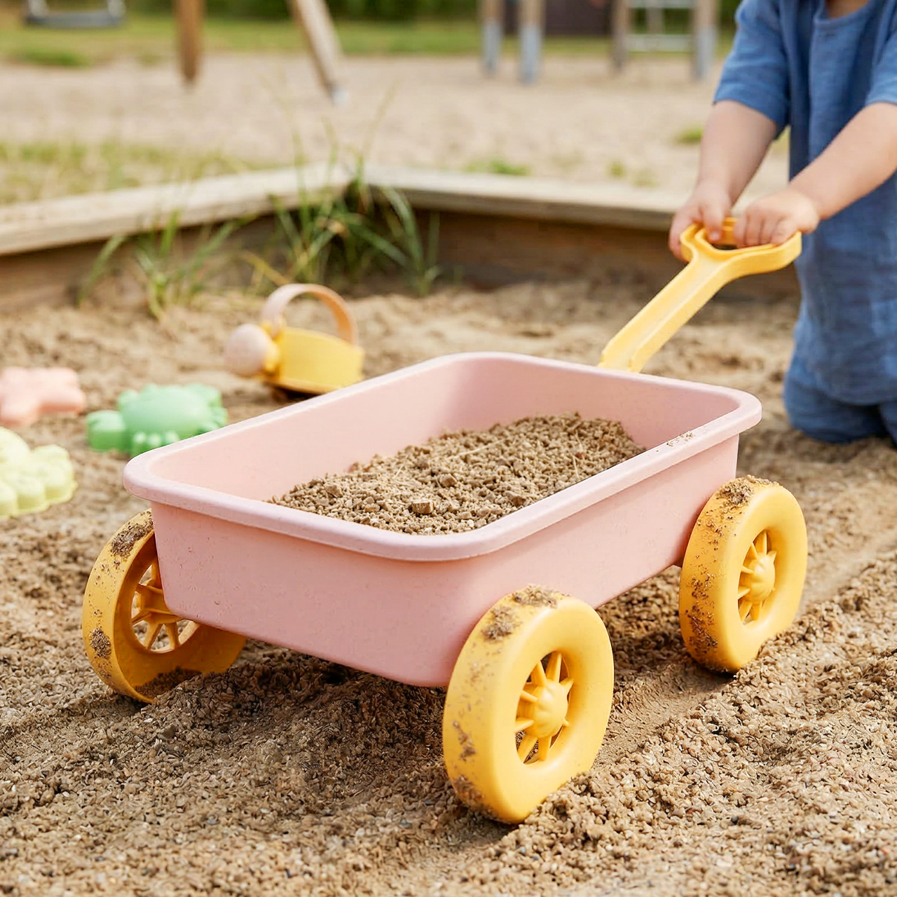 Toto není jen tak obyčejná sada na hraní s pískem, kde se doplňky rozházejí po celém dítěti. Ústředním bodem je prostorný vozík , který můžete naplnit pískem, naházet do něj hračky a vše převézt tam, kam je zábava zajímavá. Děti mají pocit, že skutečně něco převážejí, což výrazně zvyšuje jejich zapojení.