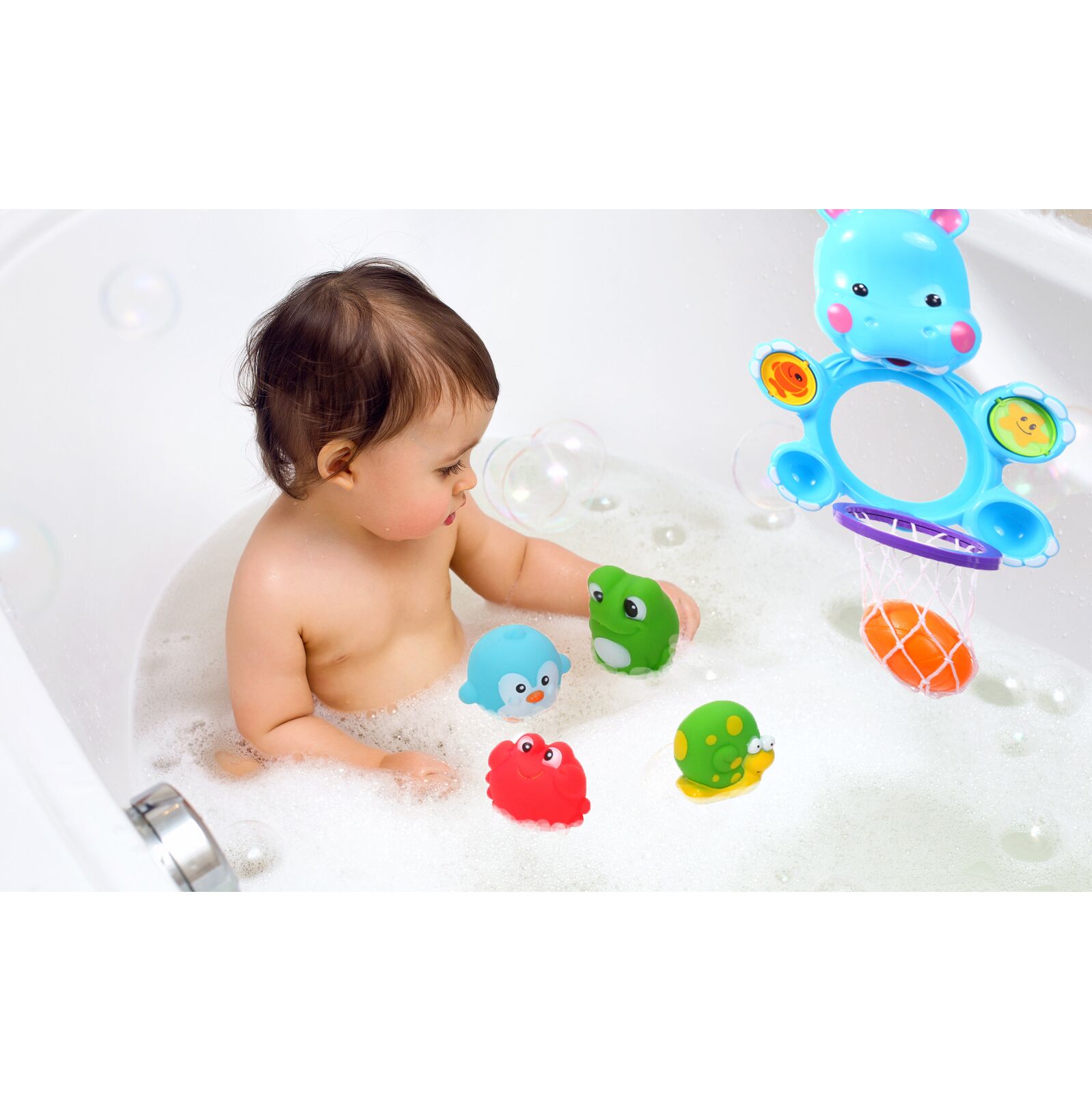 Kromě toho, že hračka plave na vodě, má na dně namontované přísavky, díky kterým můžete hipíka přilepit na zeď z dlaždic a poté můžete hrát basketbal!