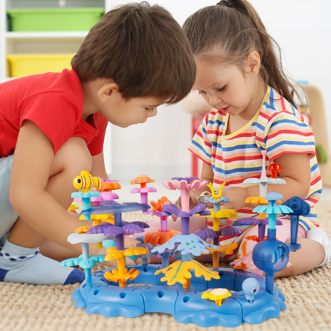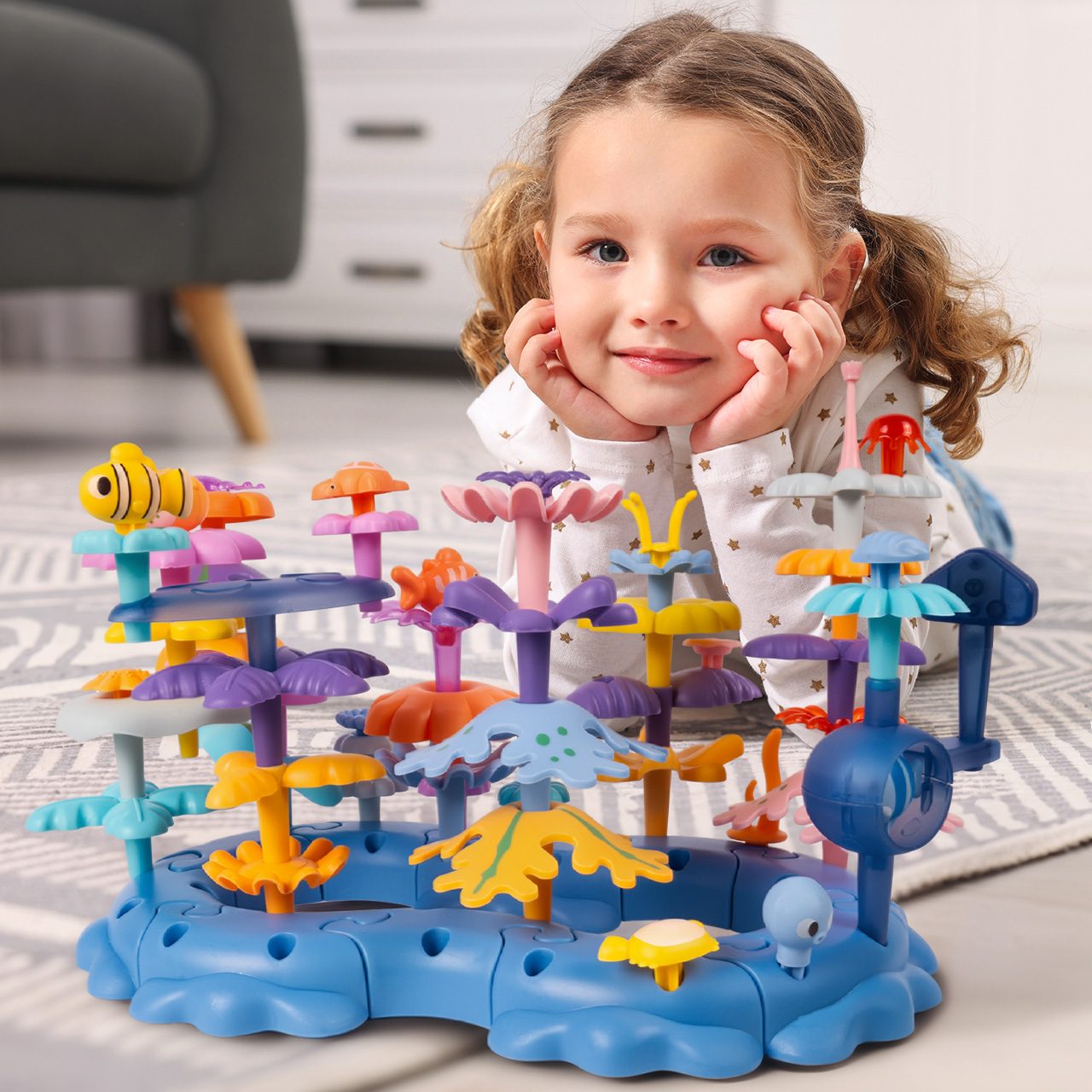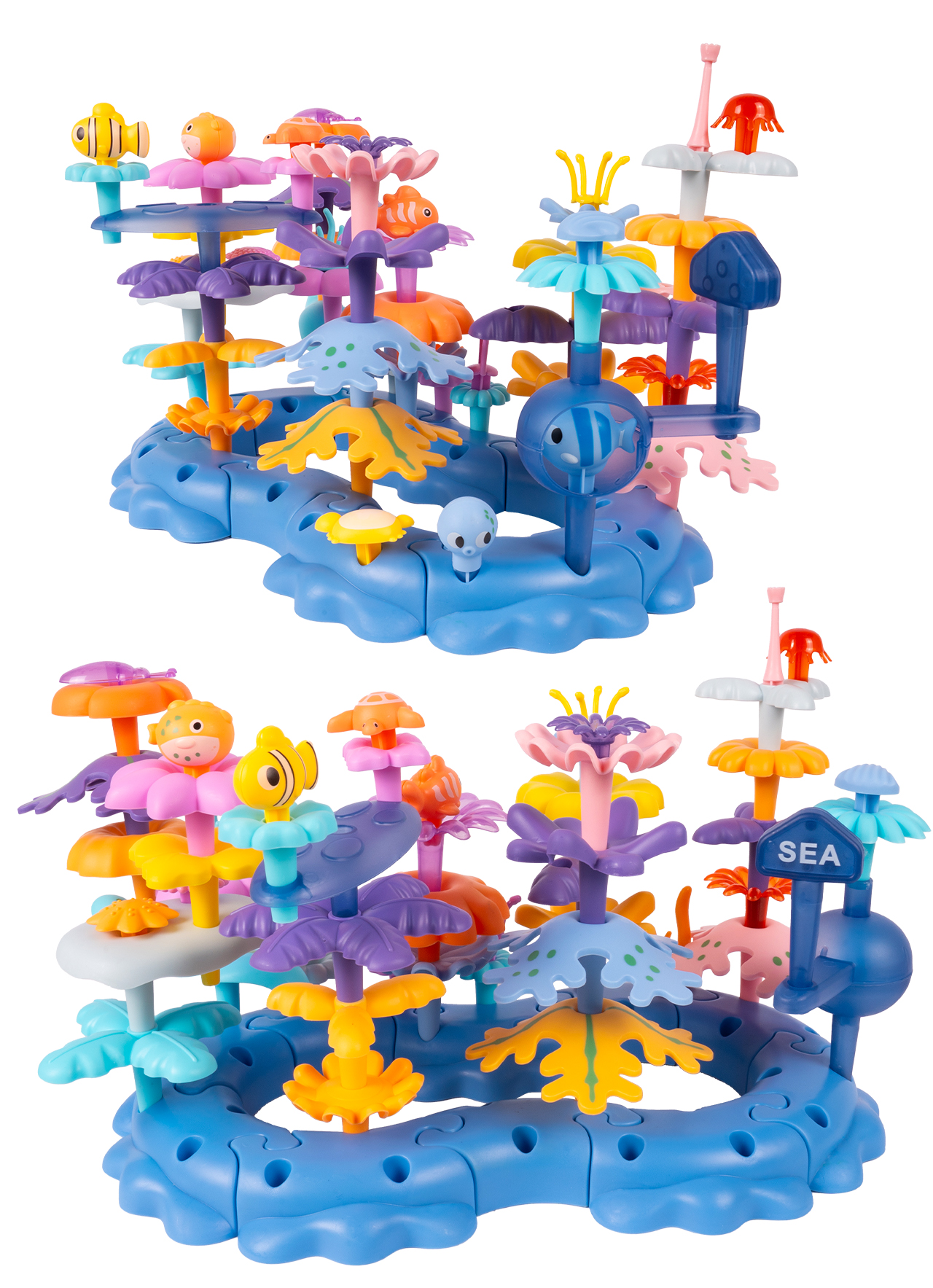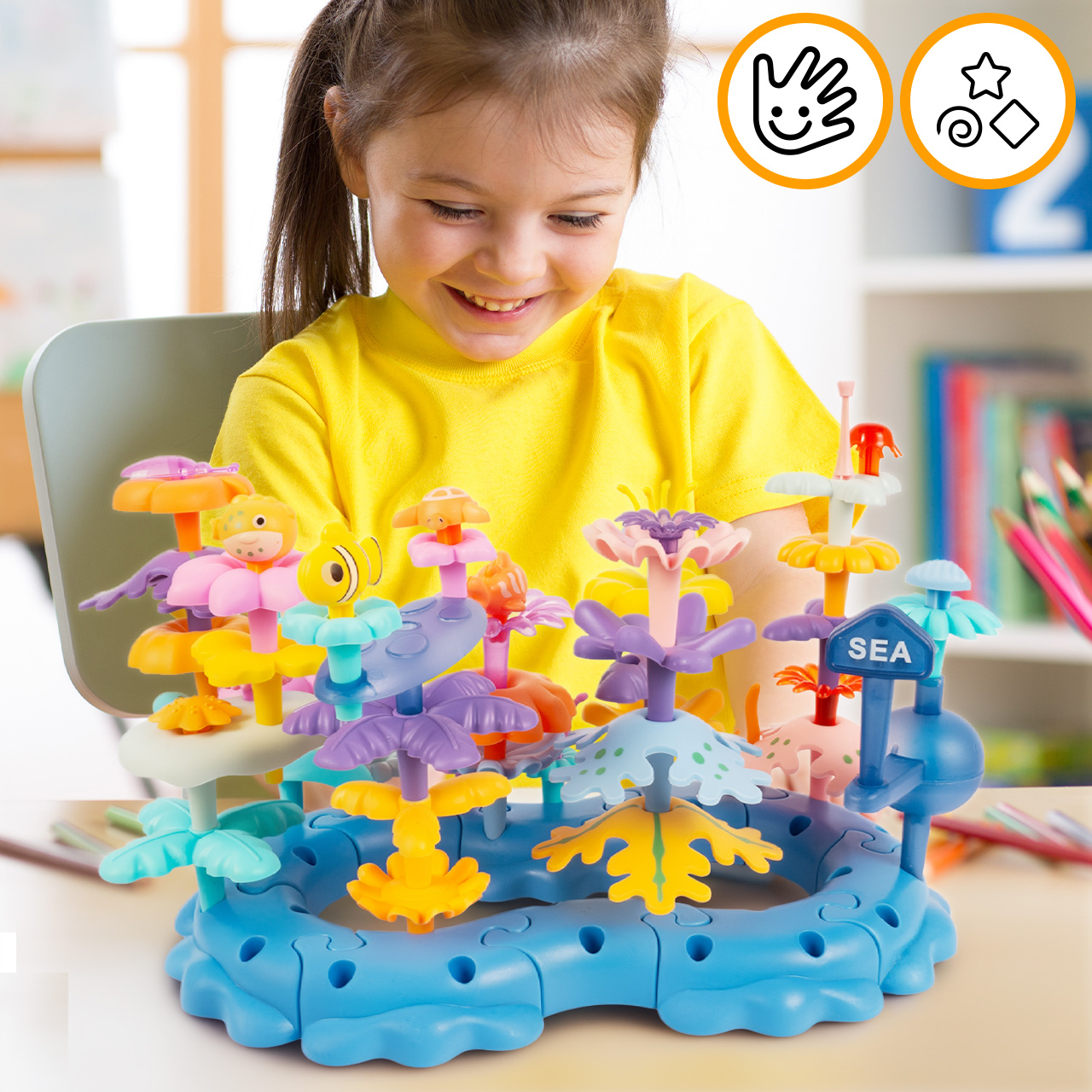 Sada obsahuje nejen základní „květinové“ prvky, ale také mořské akcenty a dekorace inspirované korálovými útesy , a také různé typy spojovacích prvků (např. tyčinky, větve, křížové spojky). Můžete vytvářet úrovně, cesty a věže – každý projekt vypadá jinak! Tato hračka učí strukturálním vztahům a základům stability stavby.