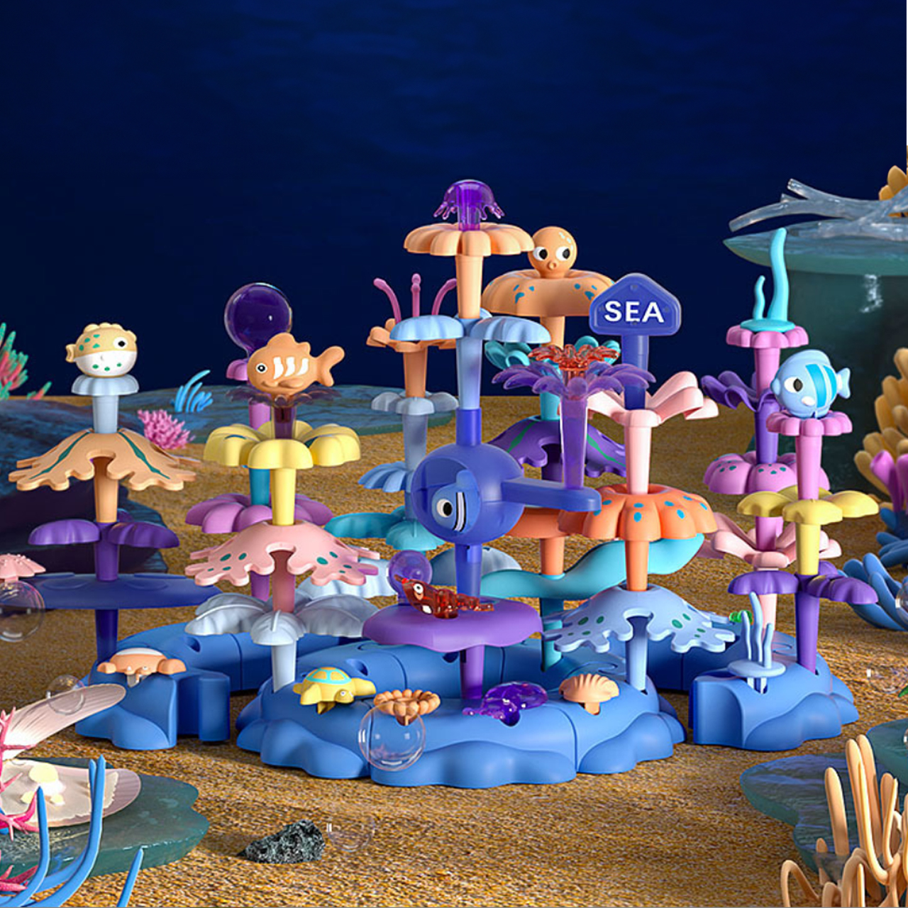 Děti se mohou ponořit do podvodního světa plného mořských rostlin a „korálových“ forem . Mořské téma inspiruje k vytváření pohádkových scén – od korálových útesů až po barevné „zahrady“. Je to skvělá příležitost k učení hrou: při stavění si můžete povídat o oceánech a jejich obyvatelích a upevňovat si názvy barev a tvarů.