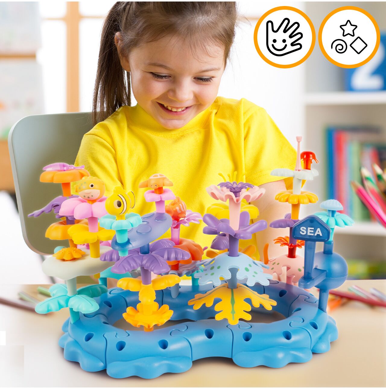 Sada obsahuje nejen základní „květinové“ prvky, ale také mořské akcenty a dekorace inspirované korálovými útesy , a také různé typy spojovacích prvků (např. tyčinky, větve, křížové spojky). Můžete vytvářet úrovně, cesty a věže – každý projekt vypadá jinak! Tato hračka učí strukturálním vztahům a základům stability stavby.