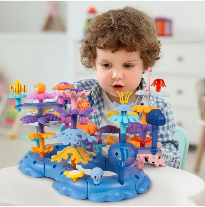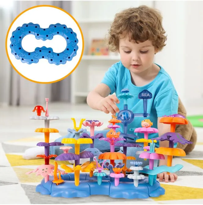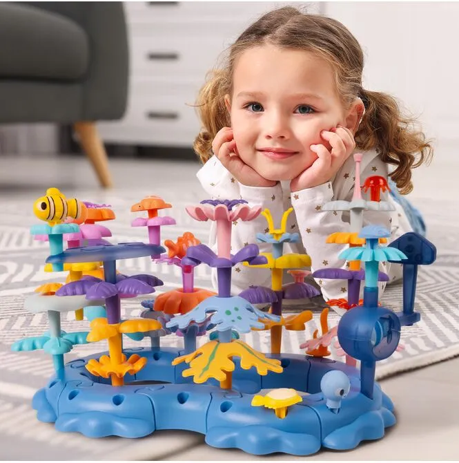 Děti se mohou ponořit do podvodního světa plného mořských rostlin a „korálových“ forem . Mořské téma inspiruje k vytváření pohádkových scén – od korálových útesů až po barevné „zahrady“. Je to skvělá příležitost k učení hrou: při stavění si můžete povídat o oceánech a jejich obyvatelích a upevňovat si názvy barev a tvarů.