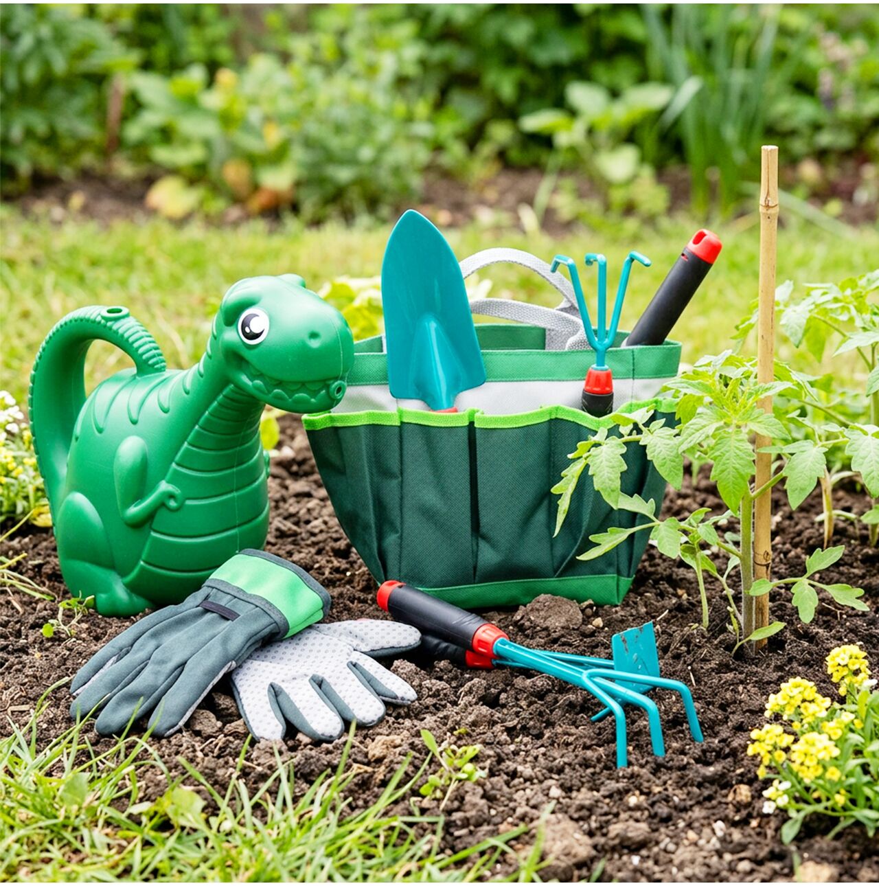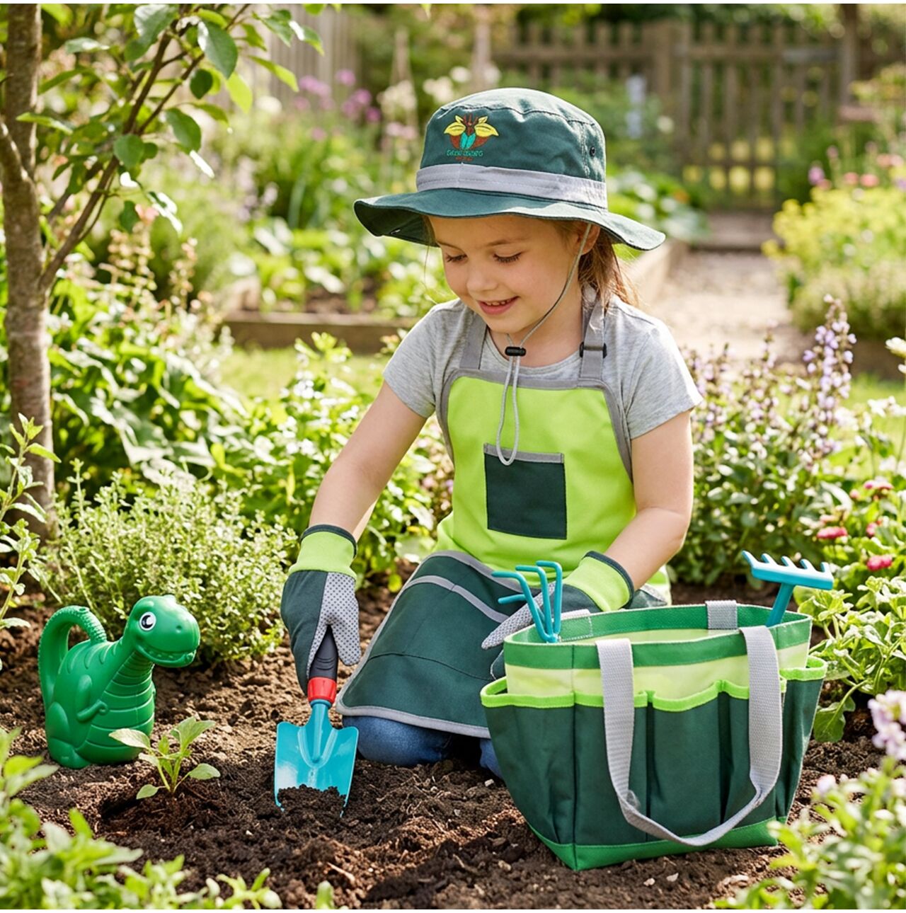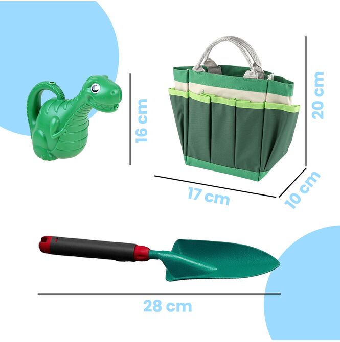 11dílná sada zahradního nářadí pro děti: konev na zalévání, zástěra s dinosaurem, taška