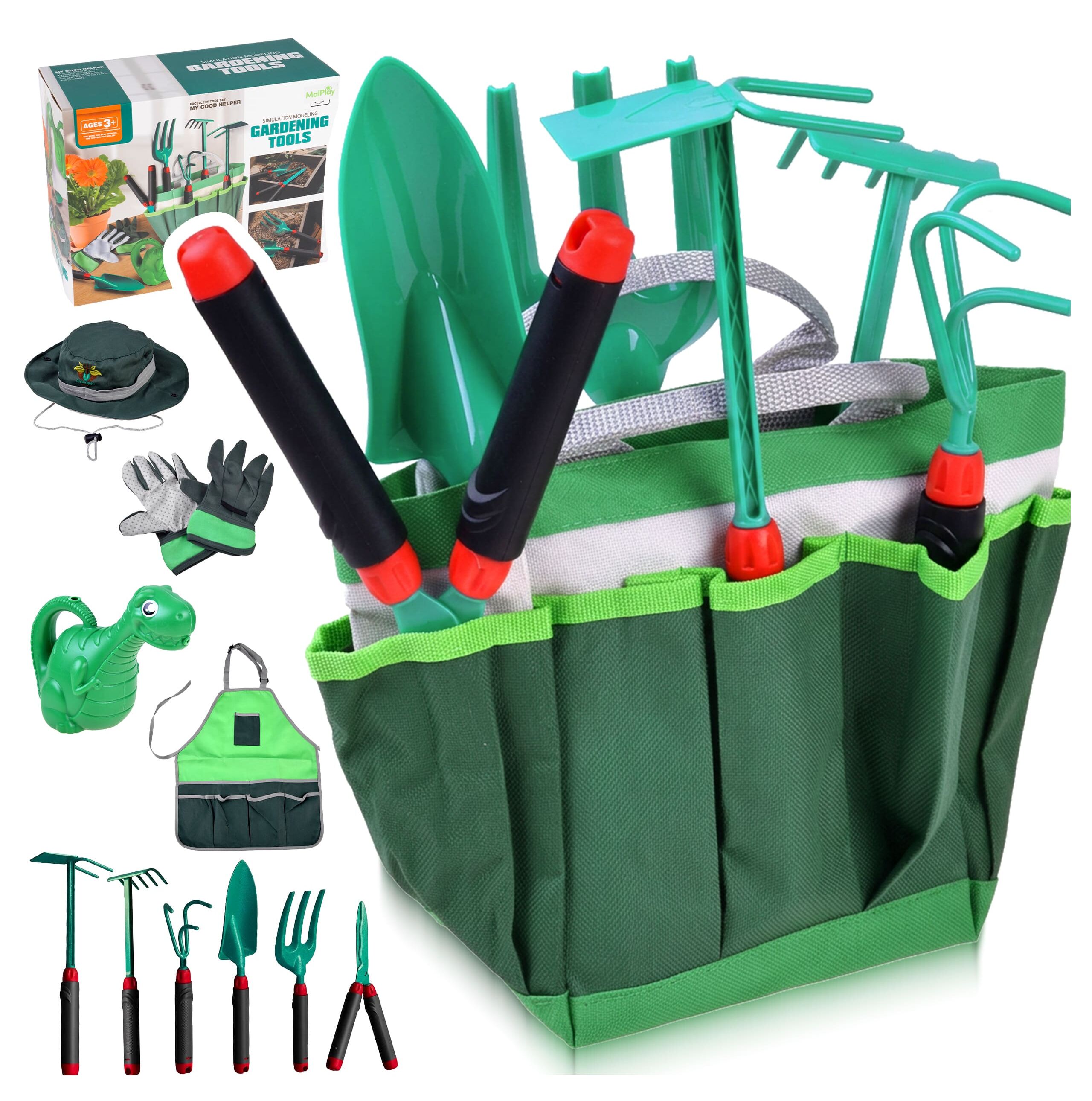 Sada obsahuje vše, co malý pomocník potřebuje: zahradní nářadí, konvici, tašku, zástěru, rukavice a čepici . Vaše dítě tak získá vlastní sadu a bude moci příslušenství pohodlně nosit v praktické tašce s kapsami. Tato sada nabízí nekonečné možnosti hraní doma, na zahradě, na pozemku nebo při rodinných výletech.
