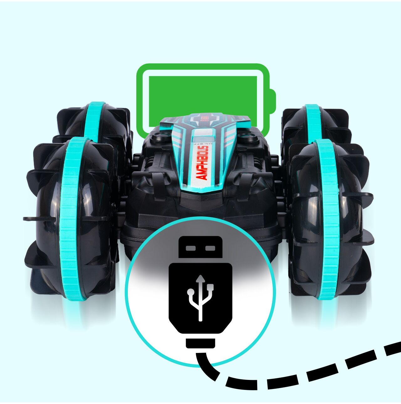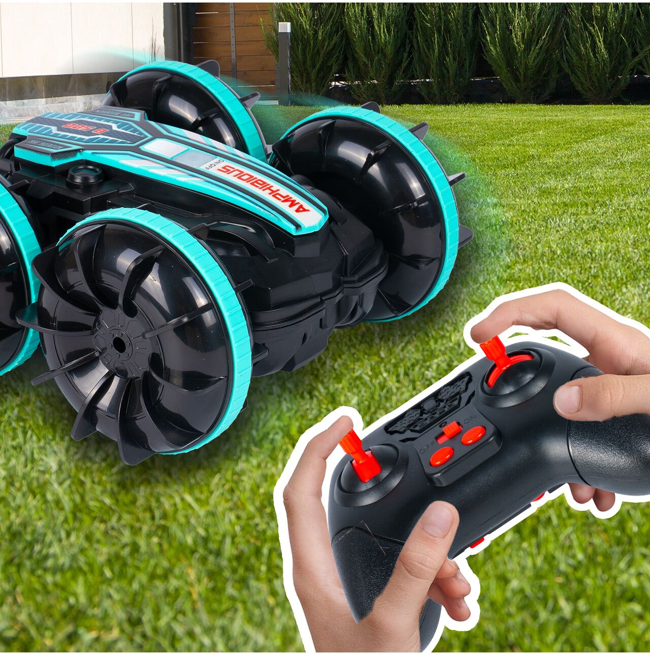 Uszczelniona konstrukcja oraz koła z łopatkami pozwalają na dynamiczną jazdę po mokrym podłożu, trawie czy śniegu. Efektowne rozpryski wody i pewna trakcja gwarantują emocje niezależnie od pogody.