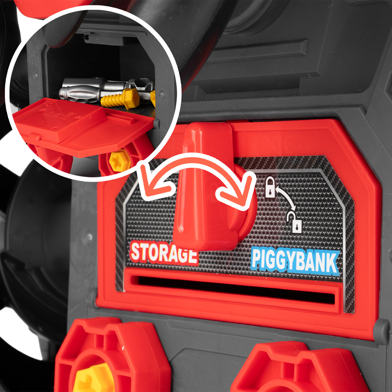 Praktyczny schowek pozwala przechowywać drobne elementy i narzędzia w jednym miejscu. To wygodne rozwiązanie dla dziecka i rodzica, bo po skończonej zabawie łatwiej utrzymać porządek i nie zgubić małych części.