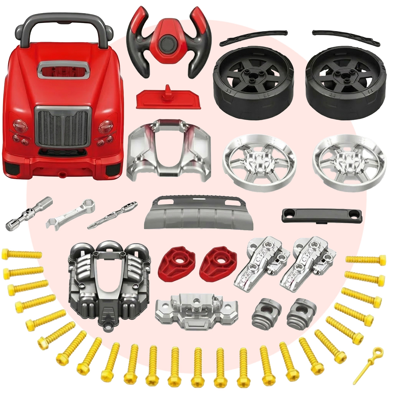 W komplecie znajdują się akcesoria mechanika, dzięki którym dziecko od razu może rozpocząć zabawę. Nie trzeba niczego dokupować, bo zestaw od początku daje możliwość odkręcania, skręcania i tworzenia własnego mini warsztatu samochodowego.