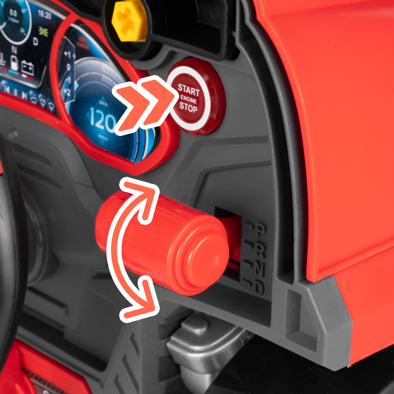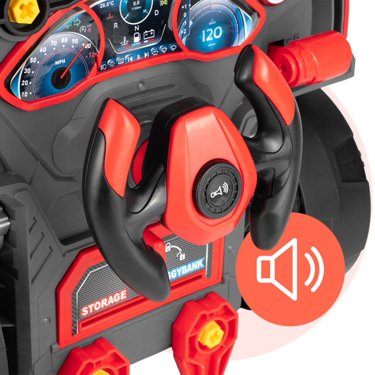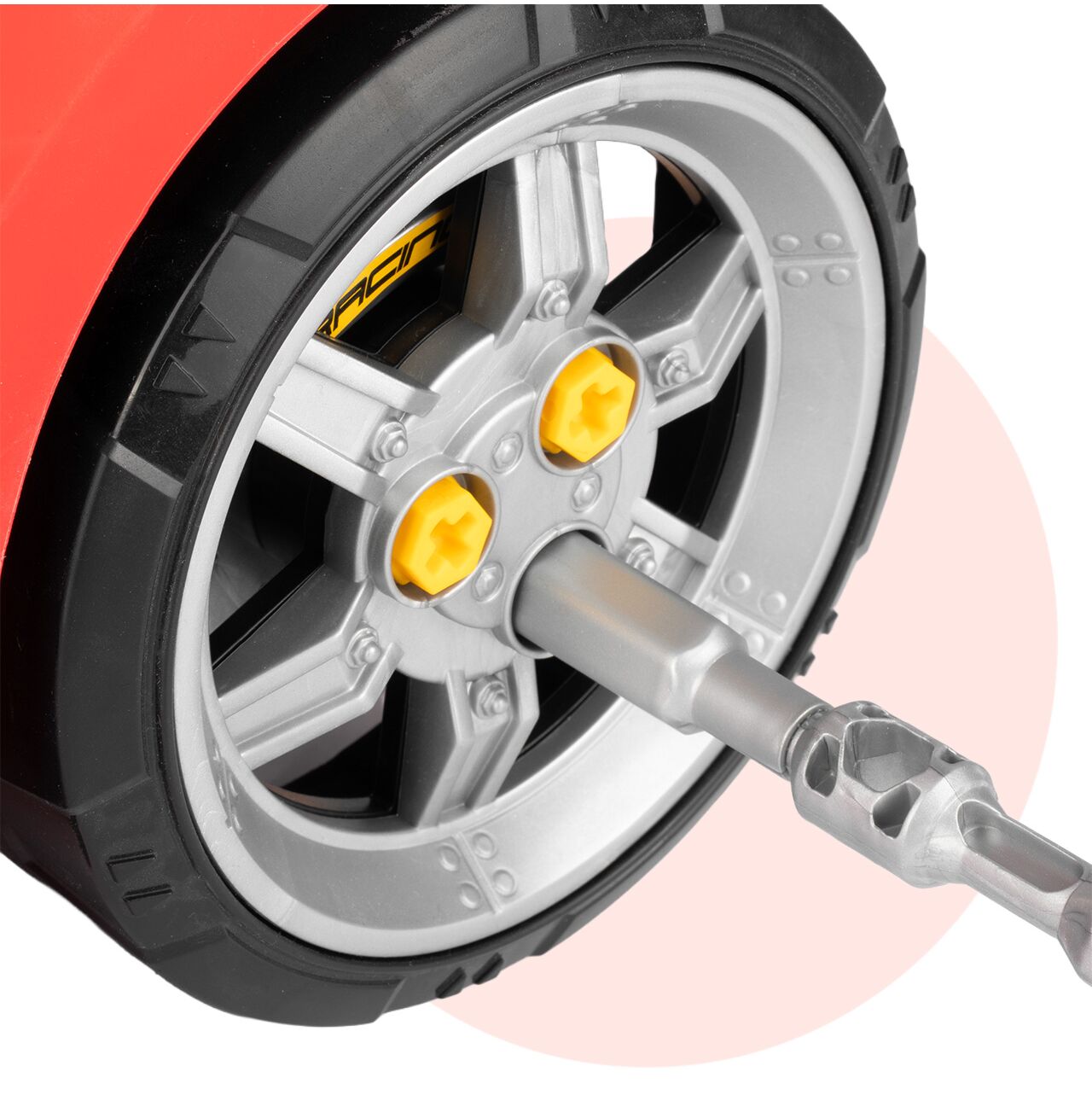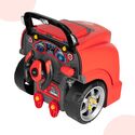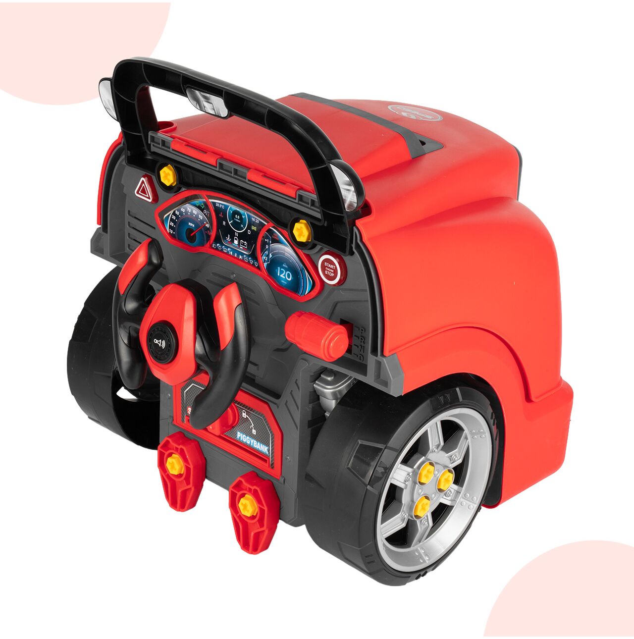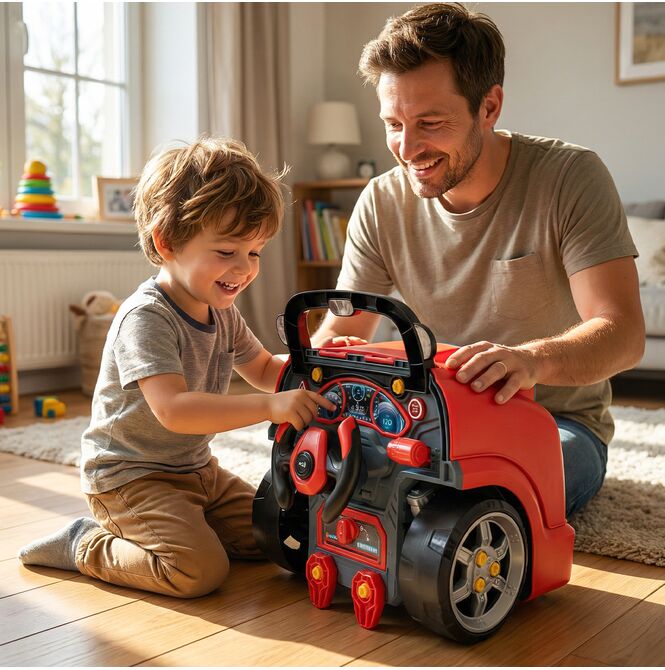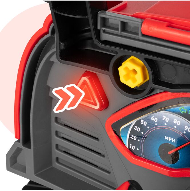 Tył zabawki został zaprojektowany tak, aby przypominał stanowisko kierowcy. Kierownica, panel i dodatkowe elementy sprawiają, że dziecko może nie tylko naprawiać auto, ale też bawić się w prowadzenie pojazdu. To zwiększa liczbę scenariuszy zabawy i wydłuża zainteresowanie produktem.