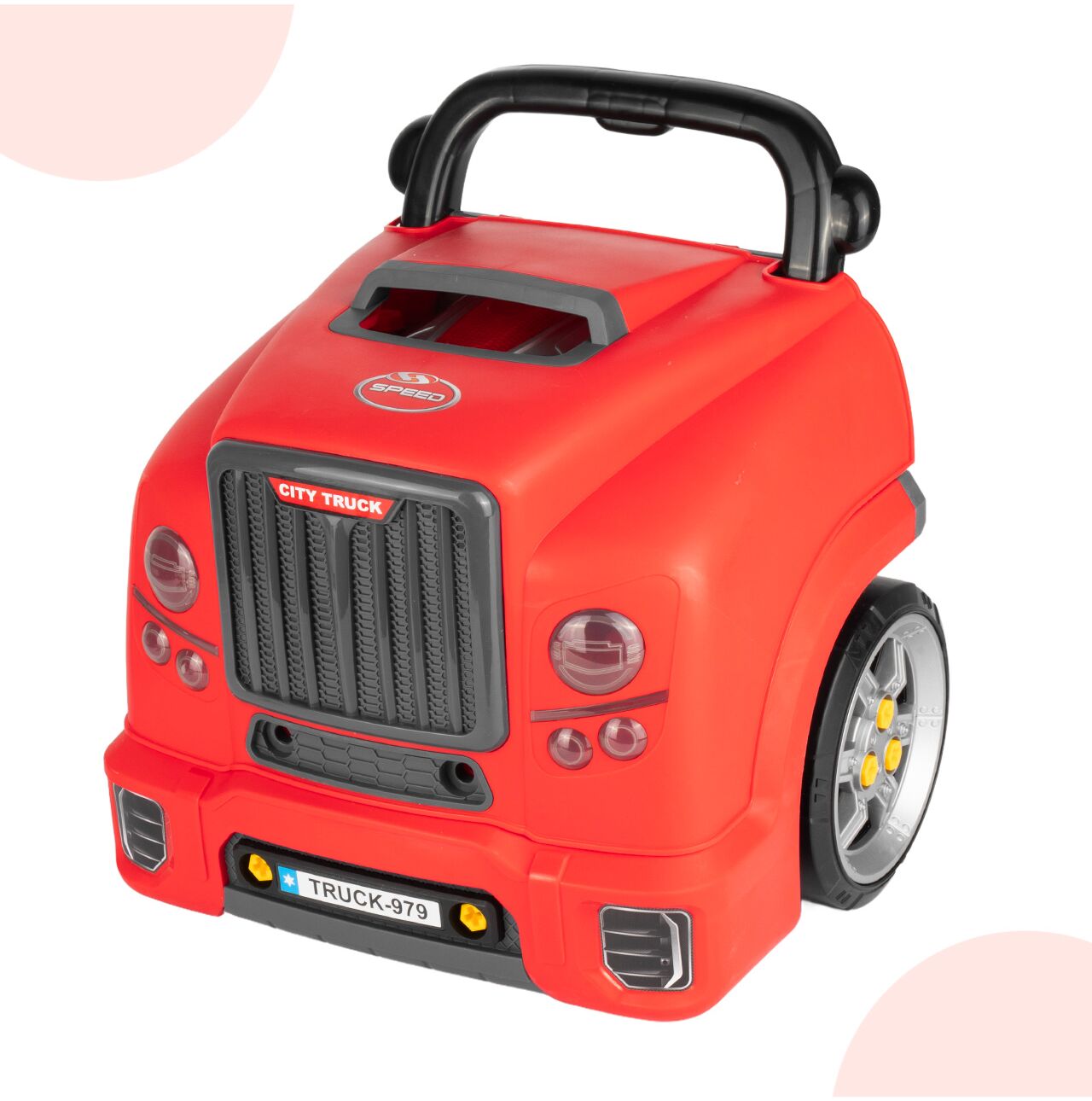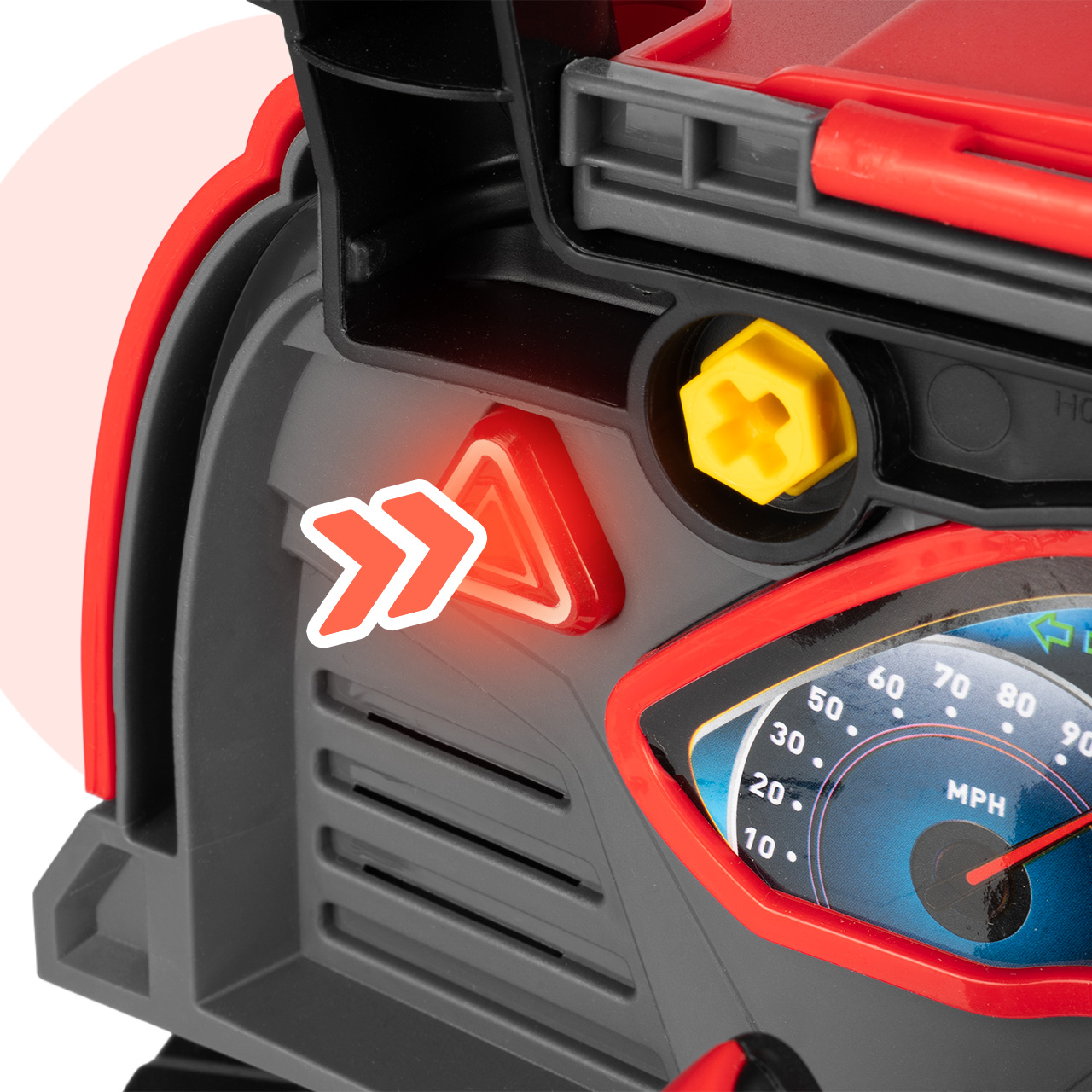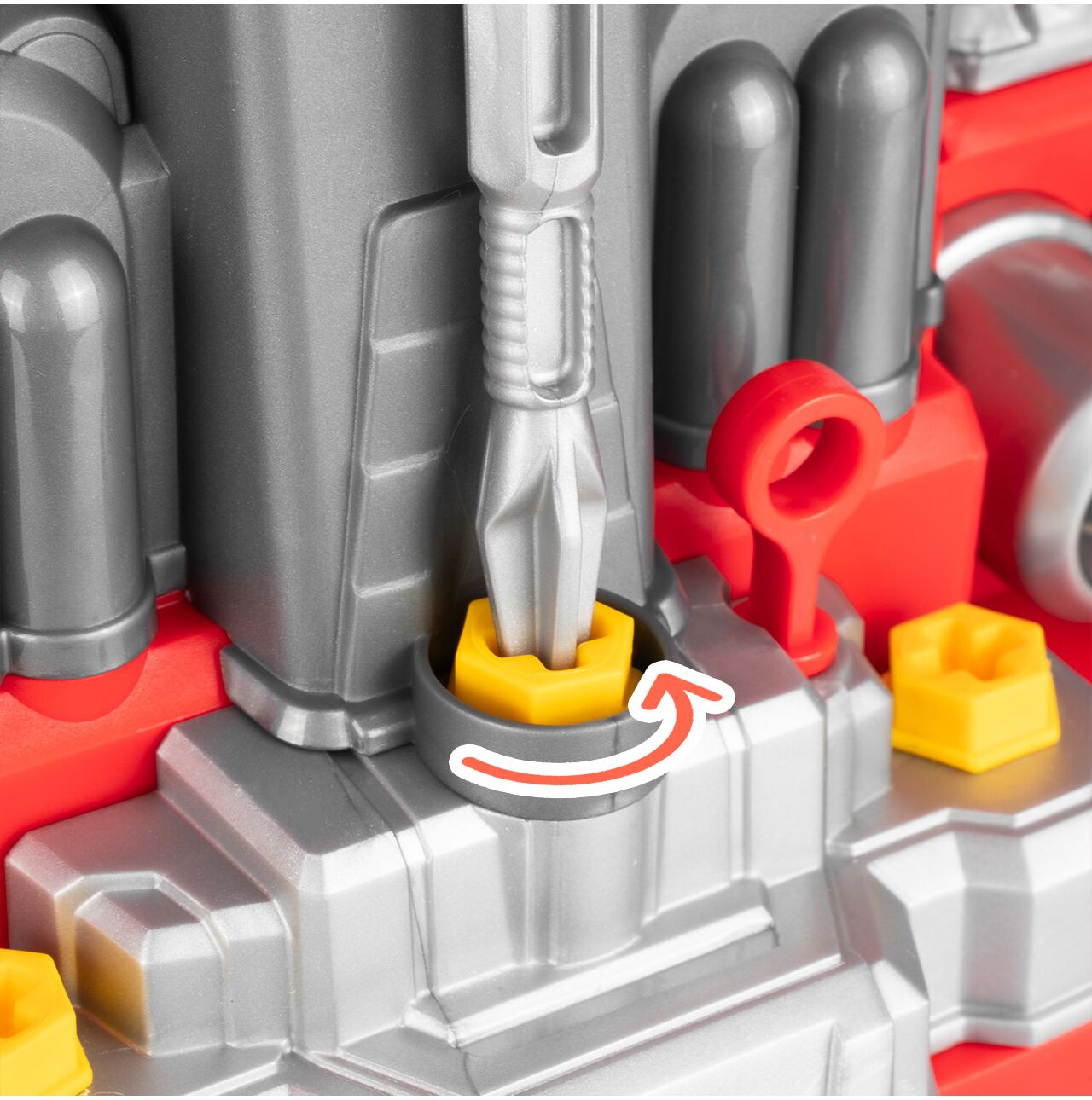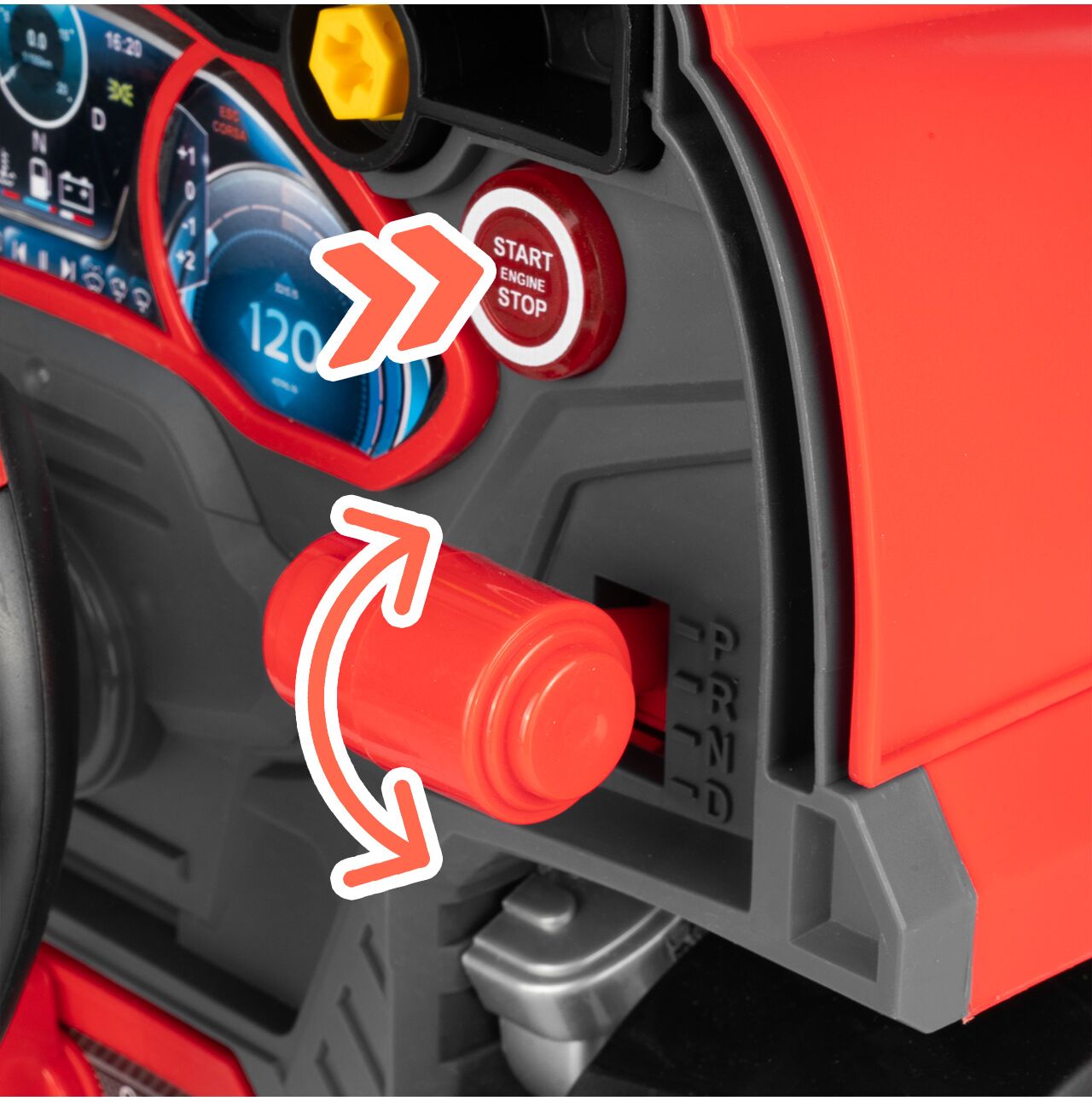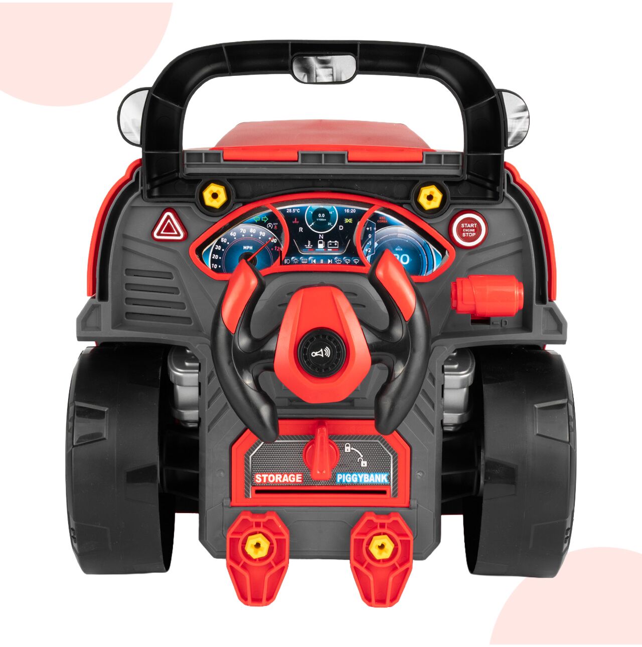 Tył zabawki został zaprojektowany tak, aby przypominał stanowisko kierowcy. Kierownica, panel i dodatkowe elementy sprawiają, że dziecko może nie tylko naprawiać auto, ale też bawić się w prowadzenie pojazdu. To zwiększa liczbę scenariuszy zabawy i wydłuża zainteresowanie produktem.