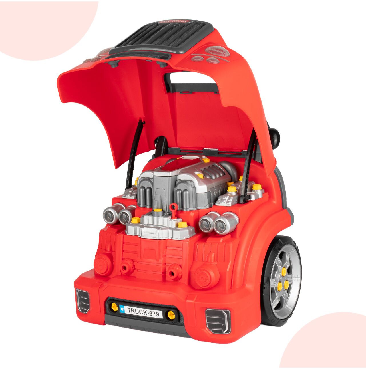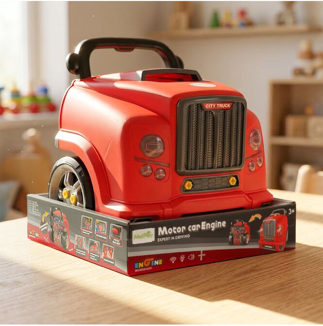Podnoszona maska to jeden z najmocniejszych punktów tej zabawki. Dziecko może zajrzeć do środka, zobaczyć silnik i rozpocząć własną naprawę. Taki detal mocno zwiększa realizm i sprawia, że zabawa staje się ciekawsza oraz bardziej angażująca.